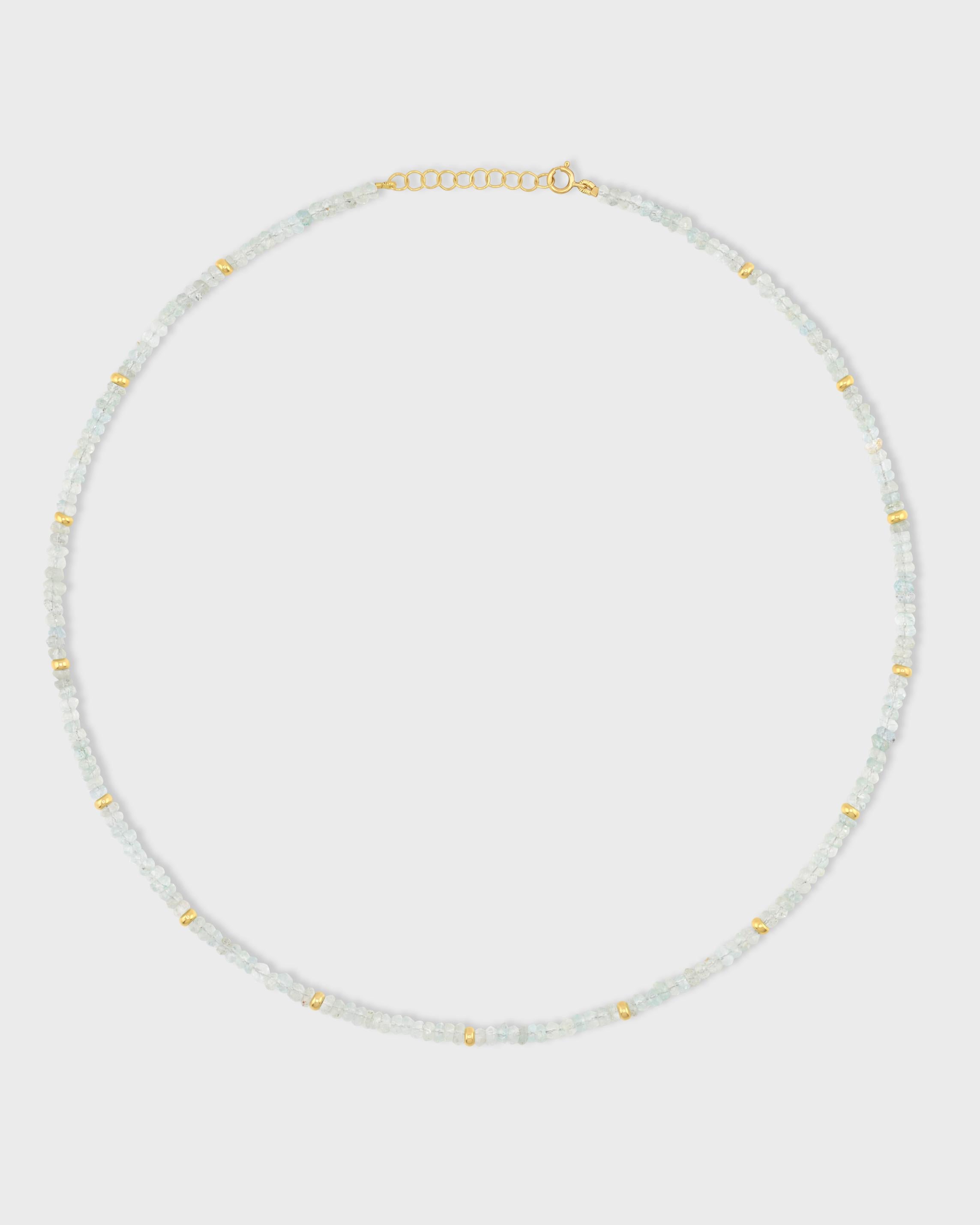 Faceted Aauamrine beads are thoughtfully hand-strung with gold accents in this refined necklace, celebrating natural color and variation. A timeless everyday piece that layers beautifully or stands on its own.
