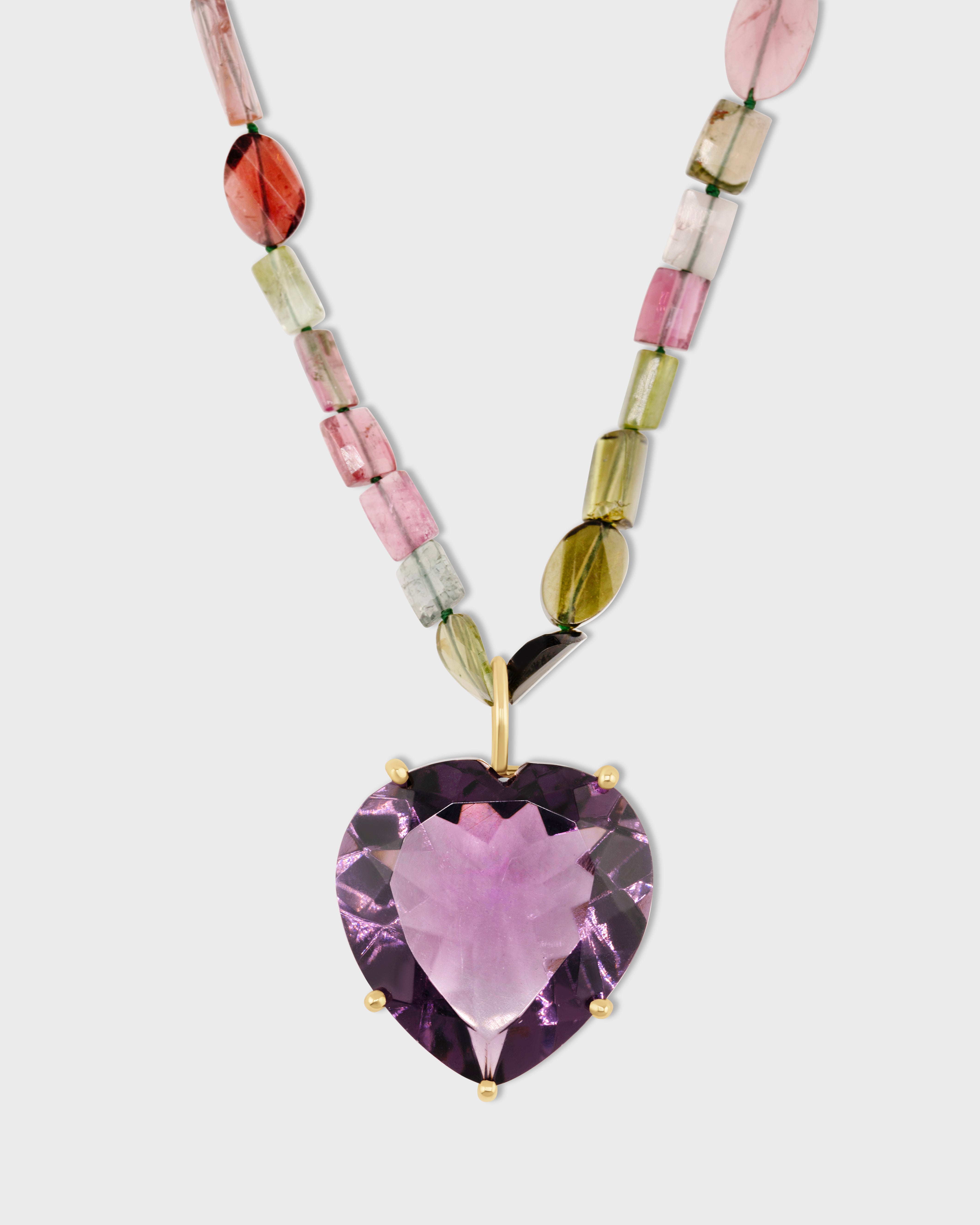 This piece features a stunning heart-shaped amethyst gemstone pendant paired with tourmaline beads set in 14k Gold. Handcrafted in NYC.
