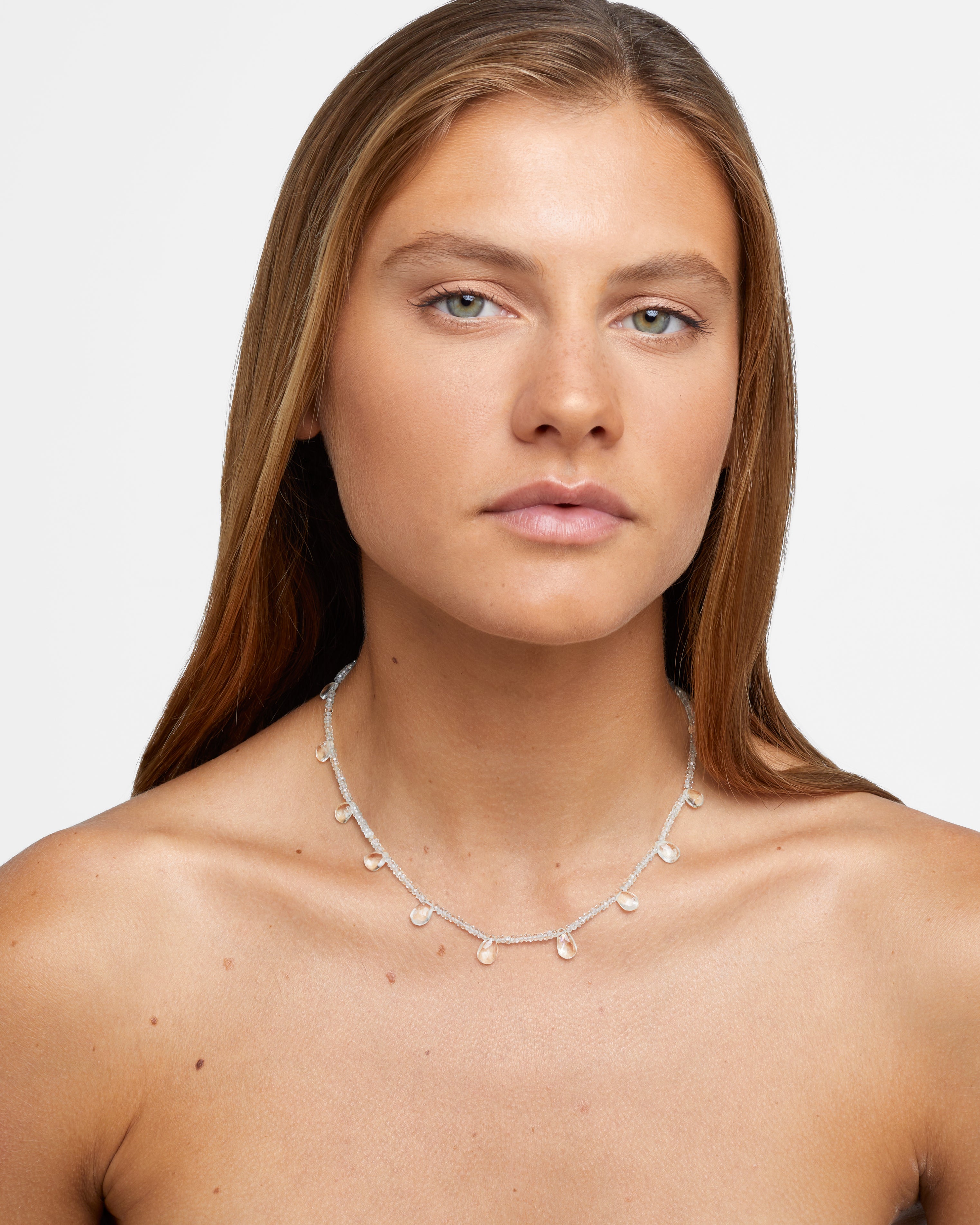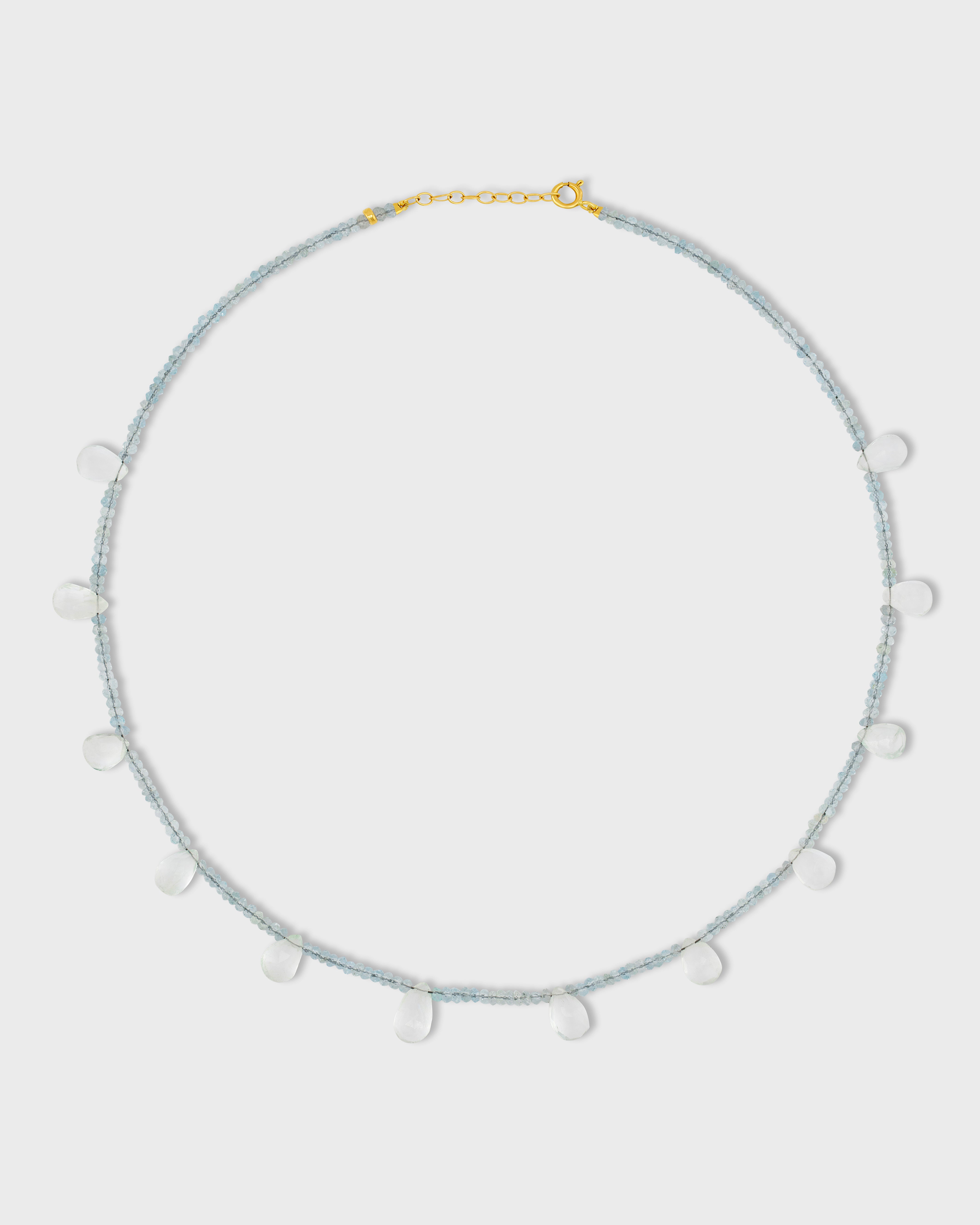 This Aquamarine Drops Necklace brings an elegant splash of serene blue hues, offering a tranquil yet sophisticated charm. The subtle gemstone drops create a fluid, graceful design perfect for every occasion.