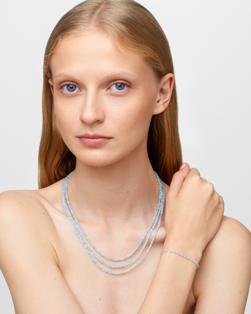 Three layers of geometrically carved aquamarine crystal hand strung in the heart of New York City and finished with 14 karat yellow gold.