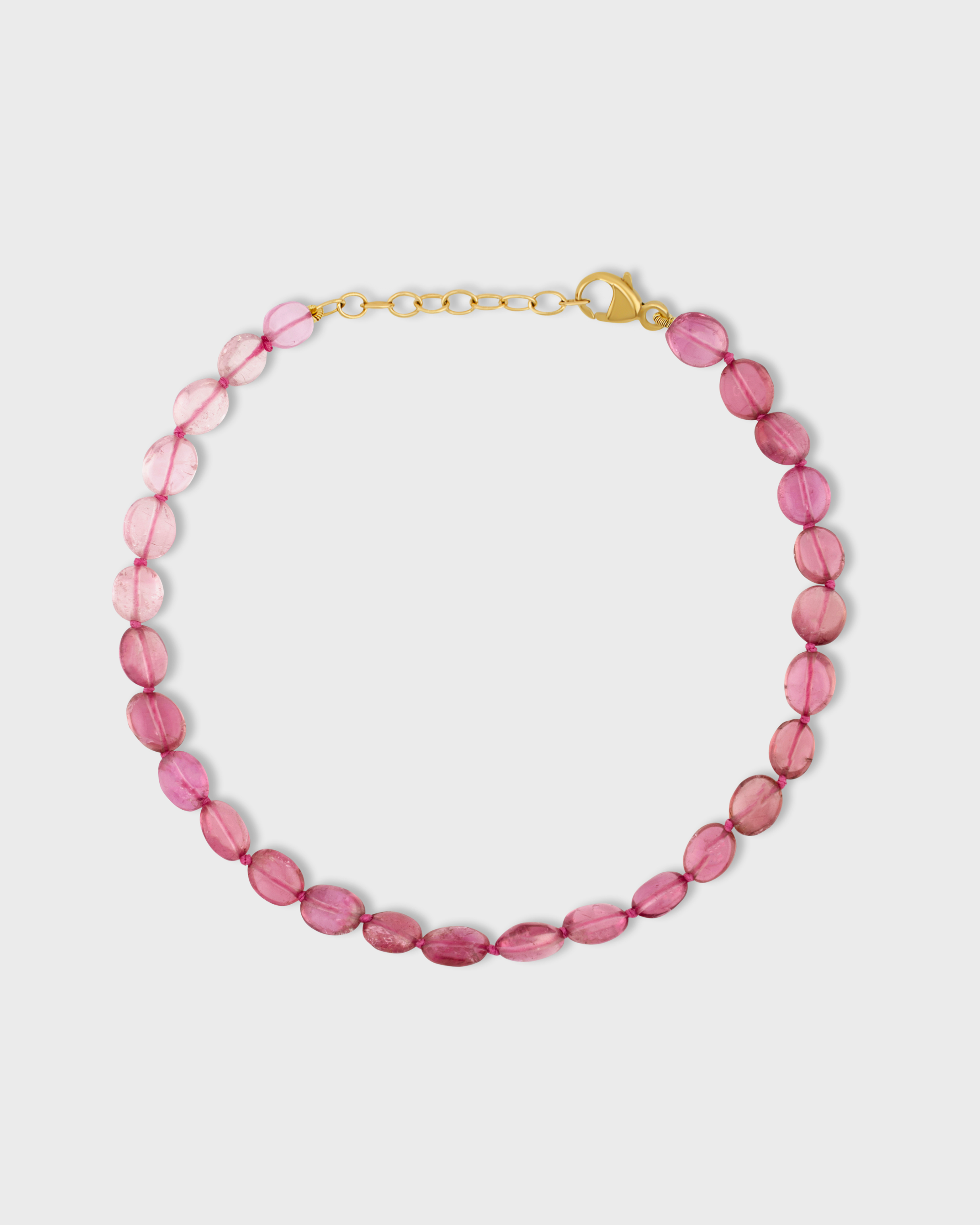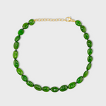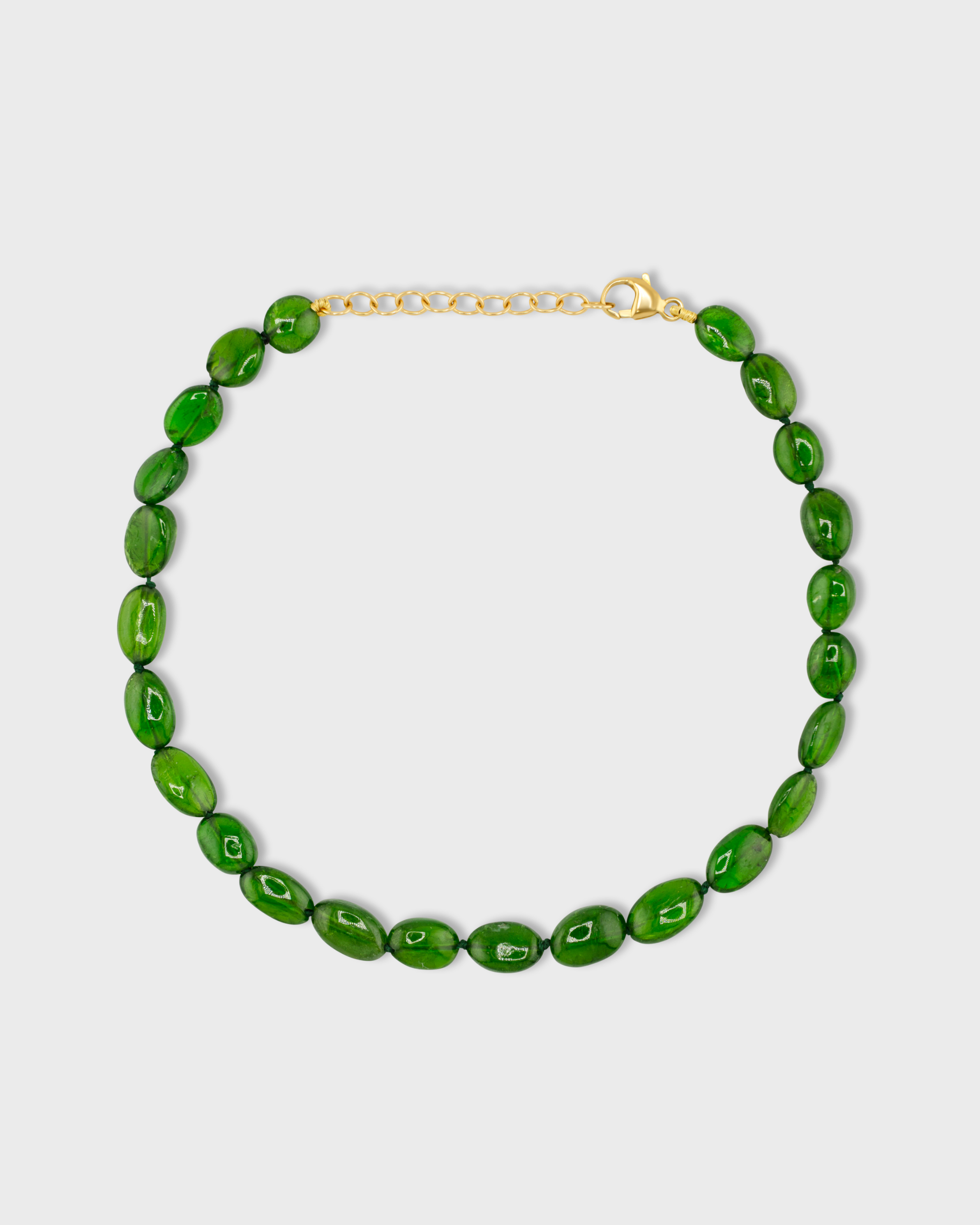 Vibrant chrome diopside candy bracelet hand knotted in New York City and finished in 14 karat gold.
