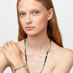 This vibrant bracelet features a gradient of green gemstones, ranging from deep emerald to lighter shades. The gemstones are interspersed with gold-filled cube beads, adding a touch of luxury and sophistication.