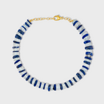 A rich blue of Lapis Lazuli and aquamarine hand cut into faceted crystals hand strung in New York City. What makes this piece special is its faceted cut nature which gives it a natural sparkle. This bracelet is finished in 14 karat gold hardware and chain.