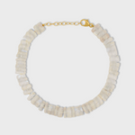 Beautiful iridescent rainbow moonstone shaped into faceted cut gemstones that are hand cut and hand strung with silk. This type of cut brings out the natural sparkle and shine in this crystal. Rainbow moonstones supports us in transformation and new beginnings. This bracelet is finished in 14 karat gold hardware and chain.
