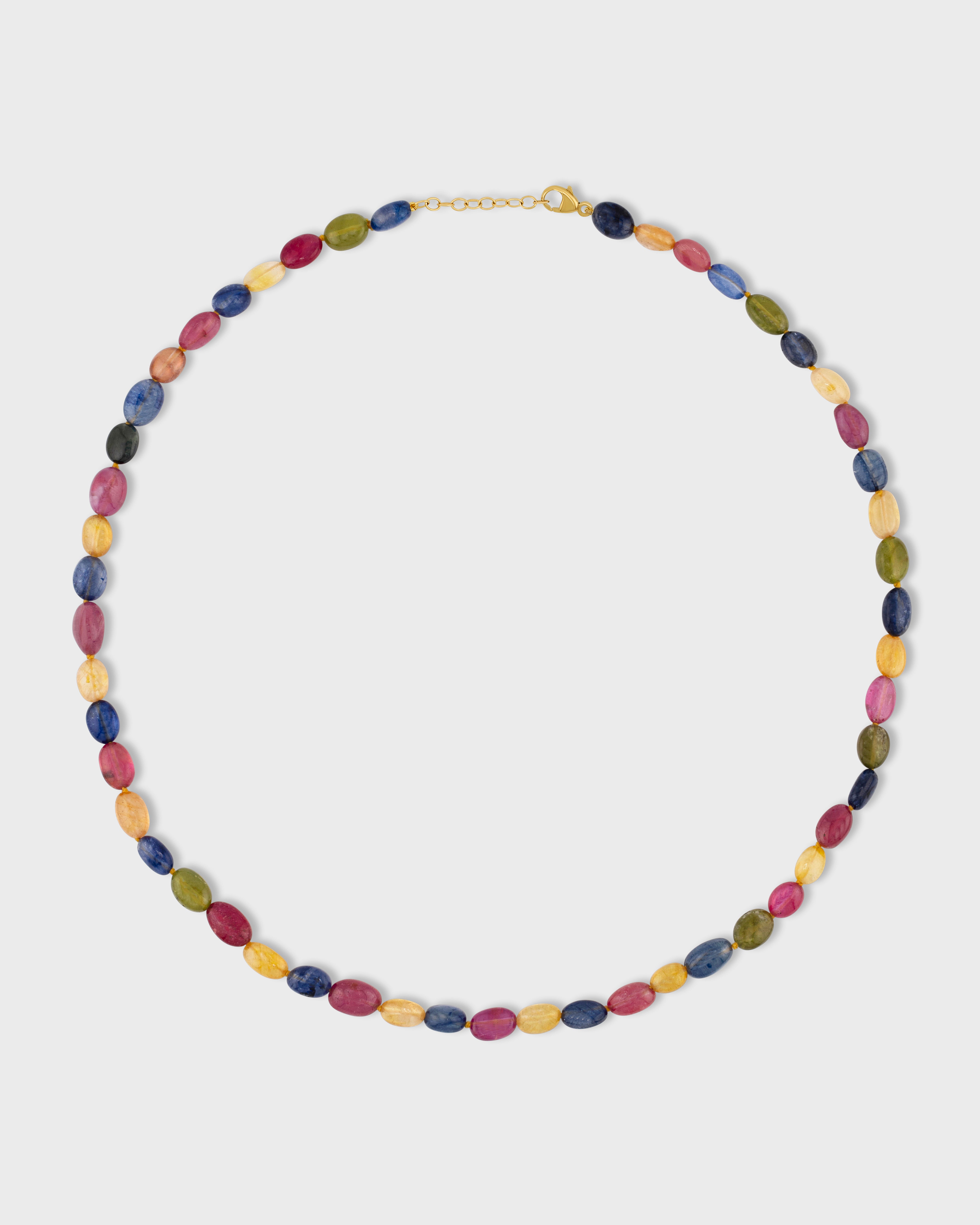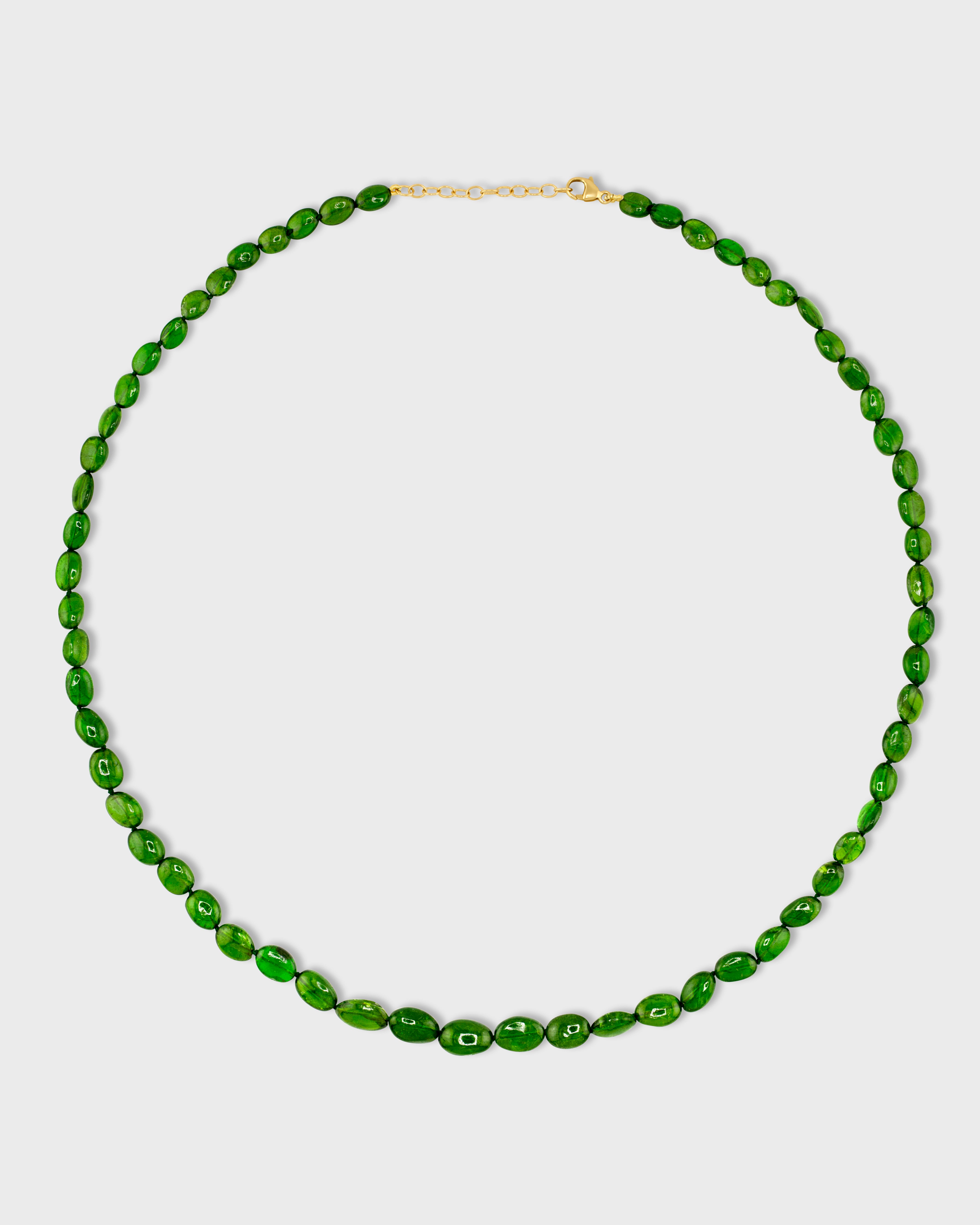 Vibrant chrome diopside candy necklace hand knotted in New York City and finished in 14 karat gold.