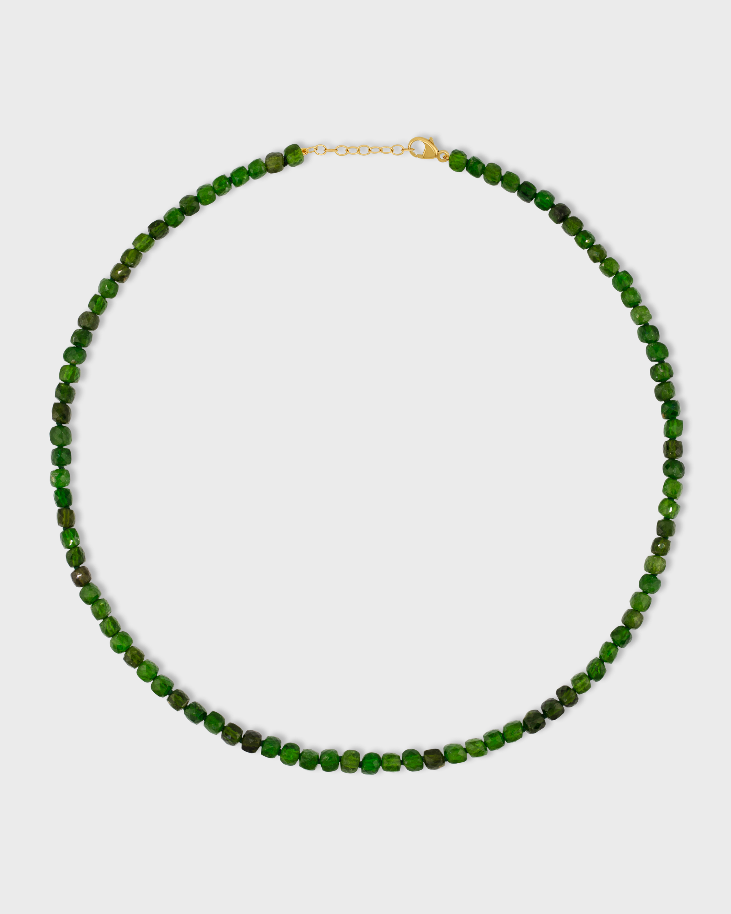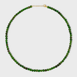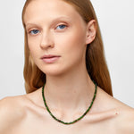 With its vivid green chrome diopside beads, this necklace radiates earthy charm and sophistication. Its unique color makes it a standout addition to any jewelry collection.