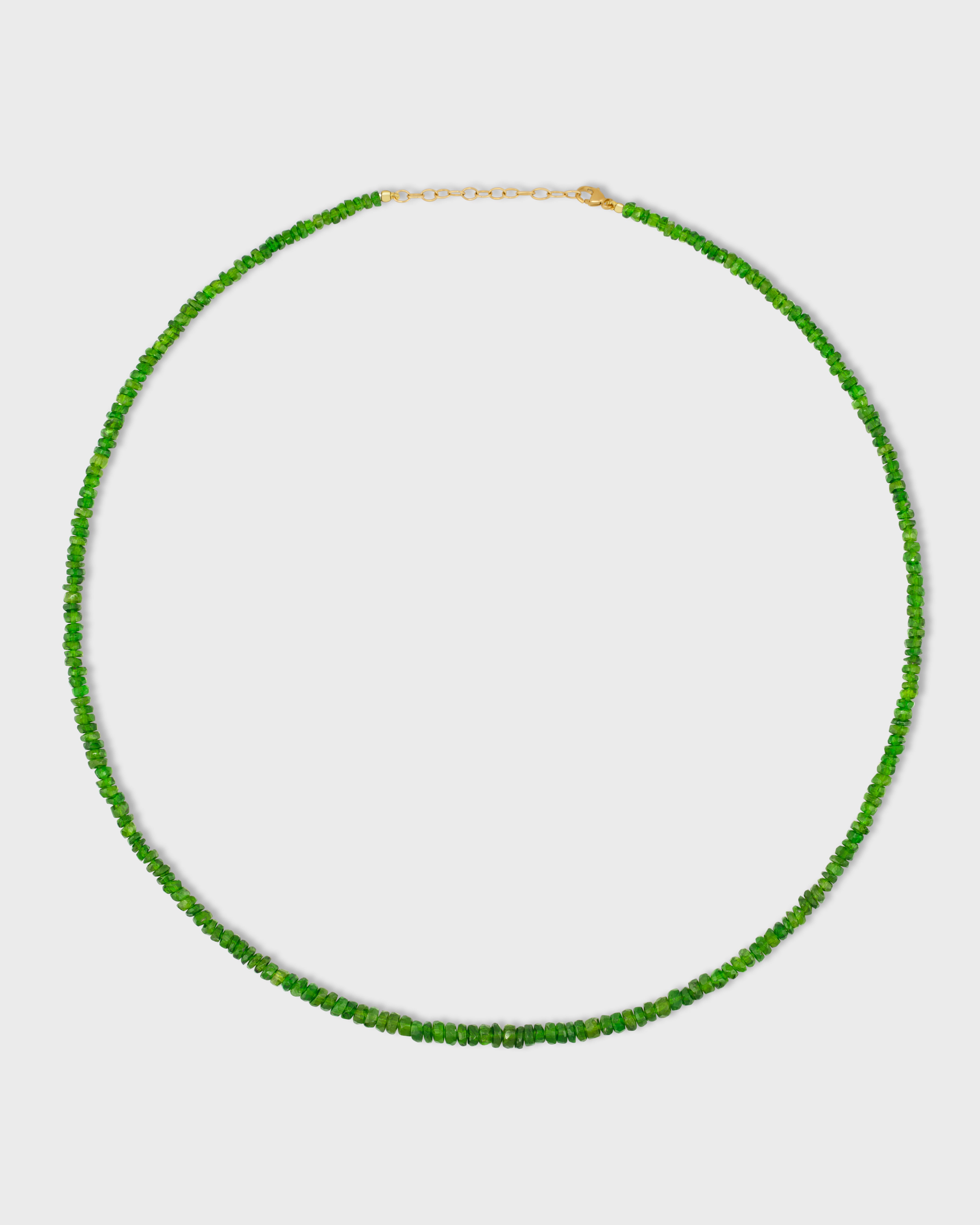 Vibrant chrome diopside necklace hand knotted in New York City and finished in 14 karat gold.