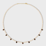 The Arizona Opal Smoky Quartz Gem Drop Necklace features delicate opal beads interspersed with stunning smoky quartz gem drops, creating a beautiful and earthy design. The natural tones and elegant drop details are complemented by a gold clasp, making this necklace both timeless and sophisticated.