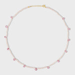 This necklace showcases soft pink hues, blending rose quartz and sparkling pink topaz for a gentle yet sophisticated look. Its delicate drop-style gemstones create a timeless and romantic aesthetic.
