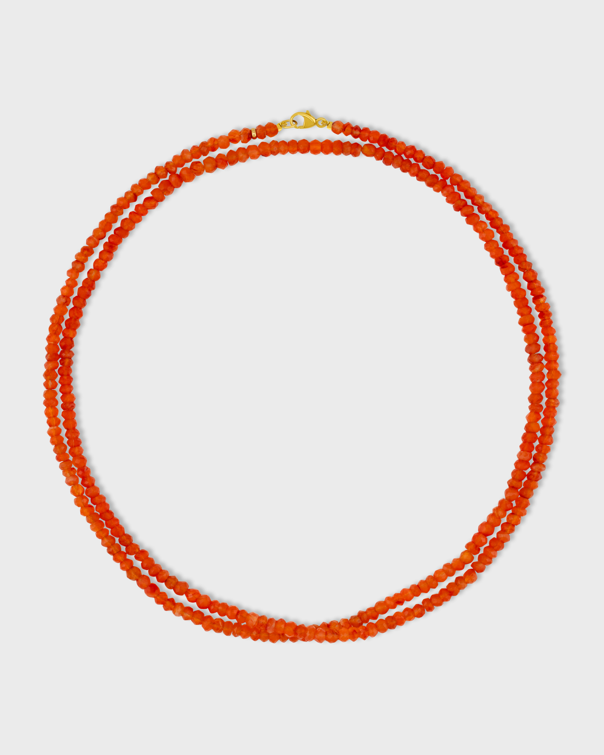 Fiery orange carnelian crystals hand strung in New York City, finished with 14 karat gold.
