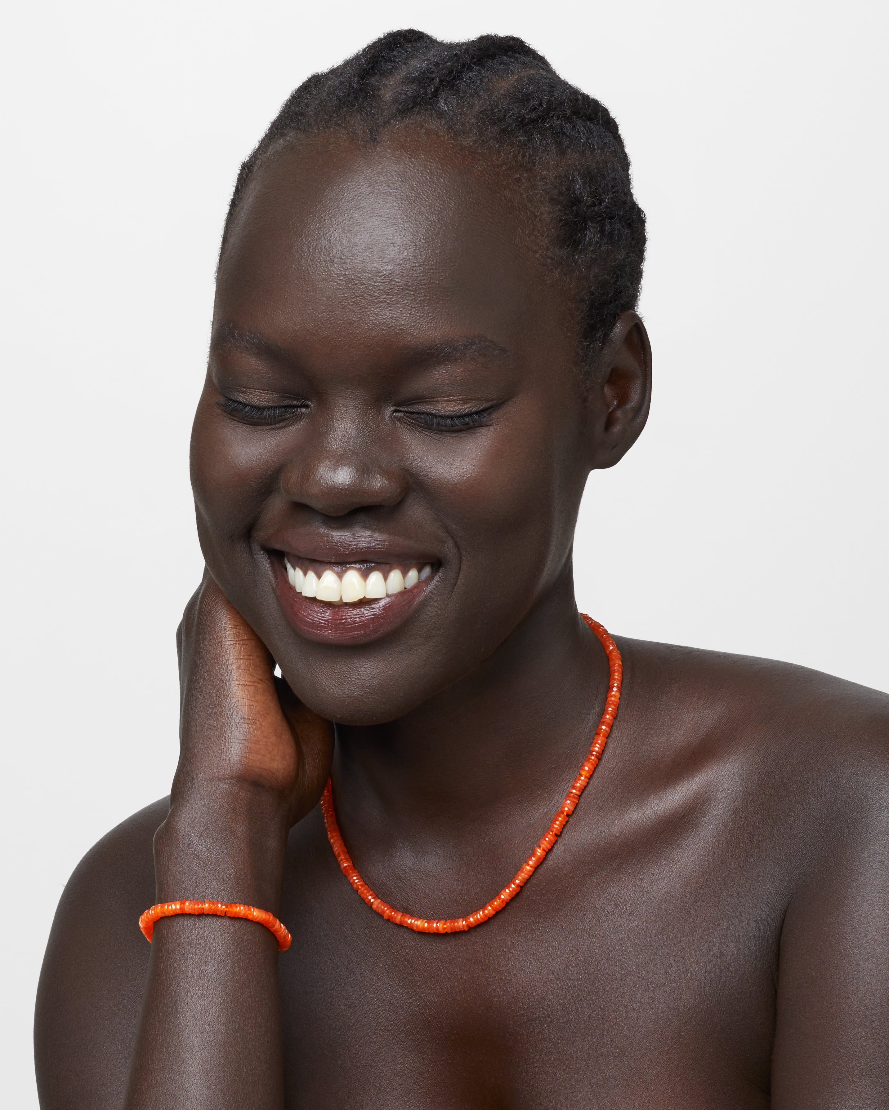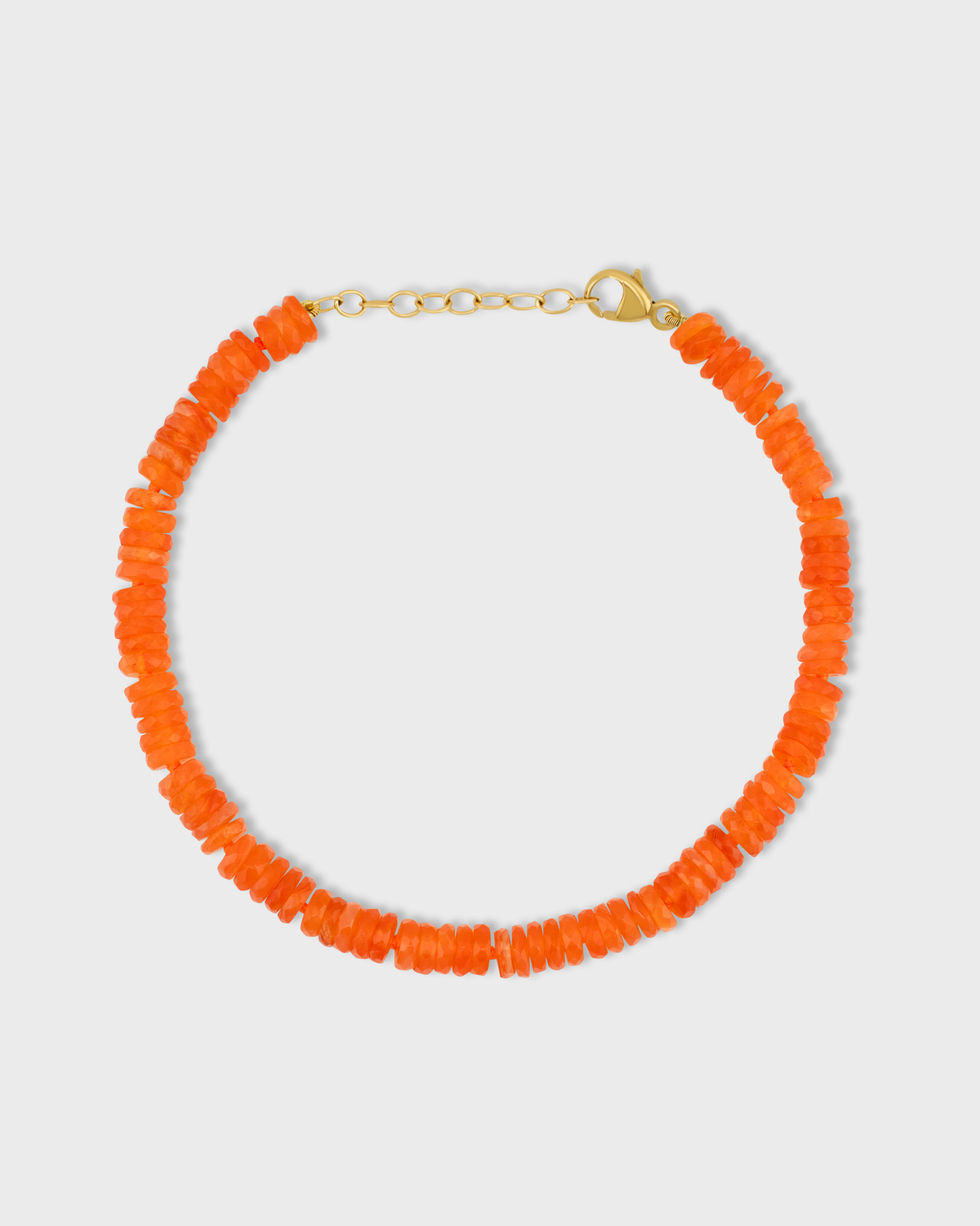 Fiery orange carnelian faceted cut crystals hand strung in New York City. This bracelet is finished with 14 karat gold.