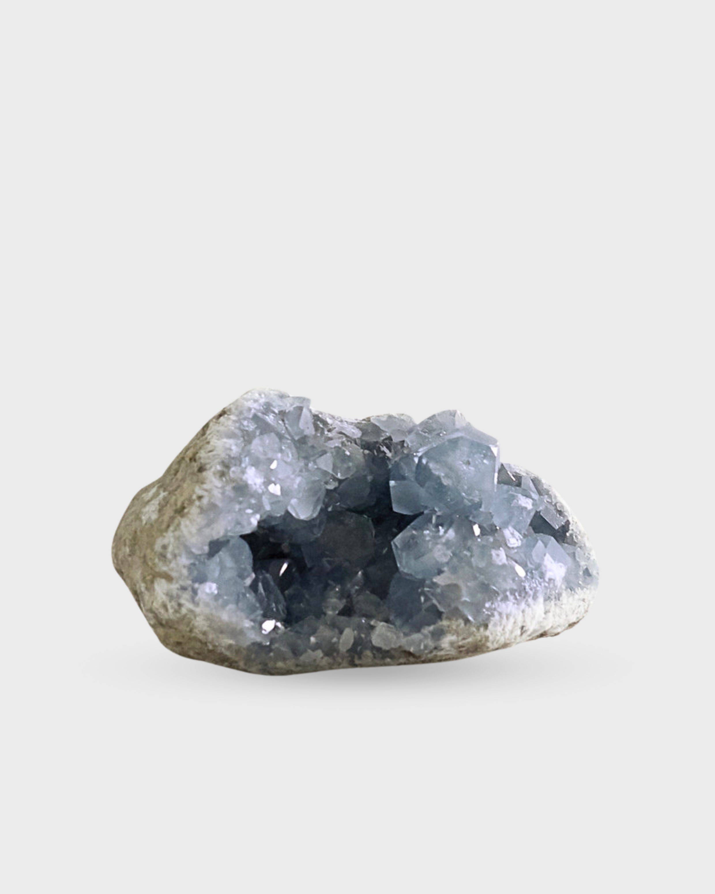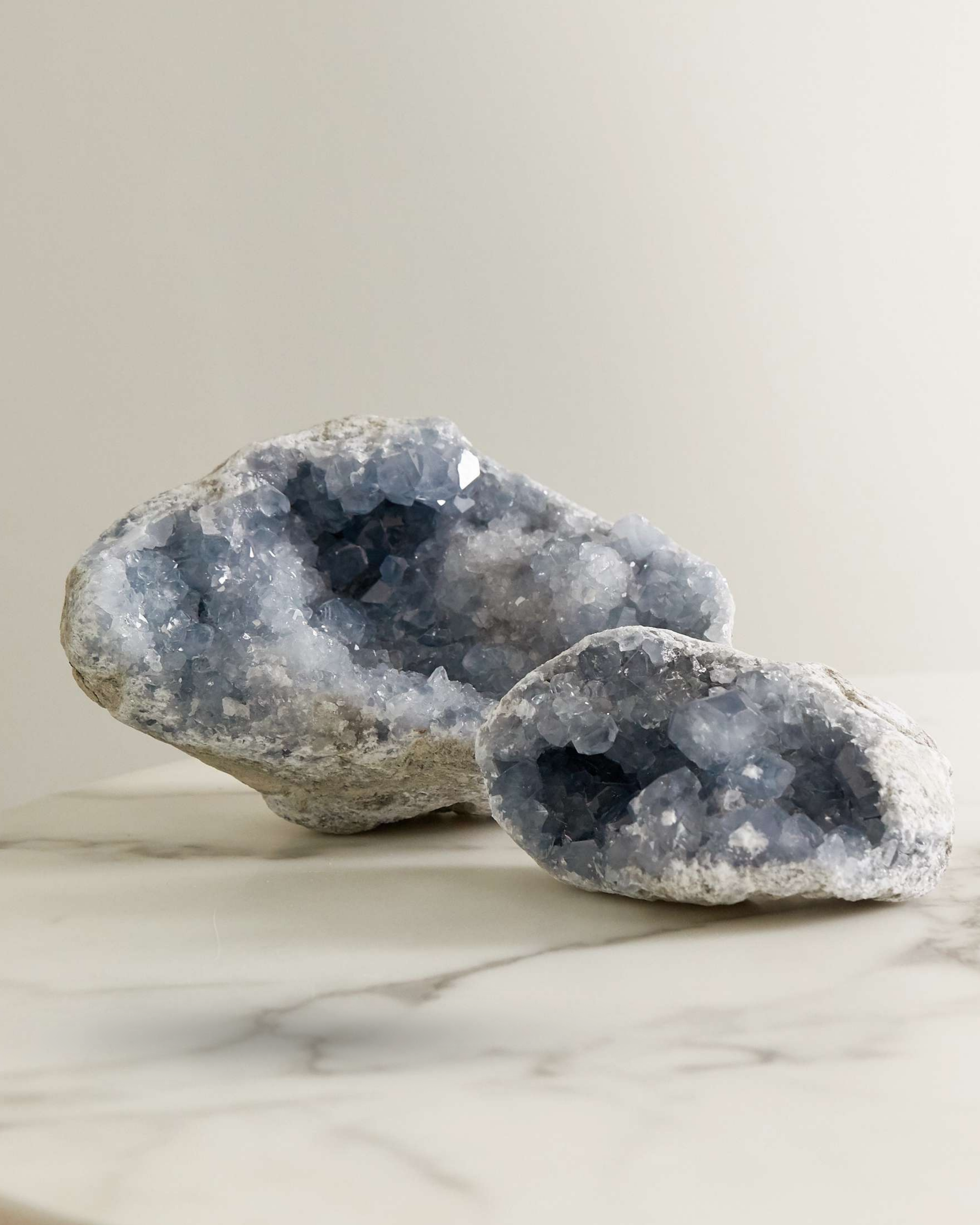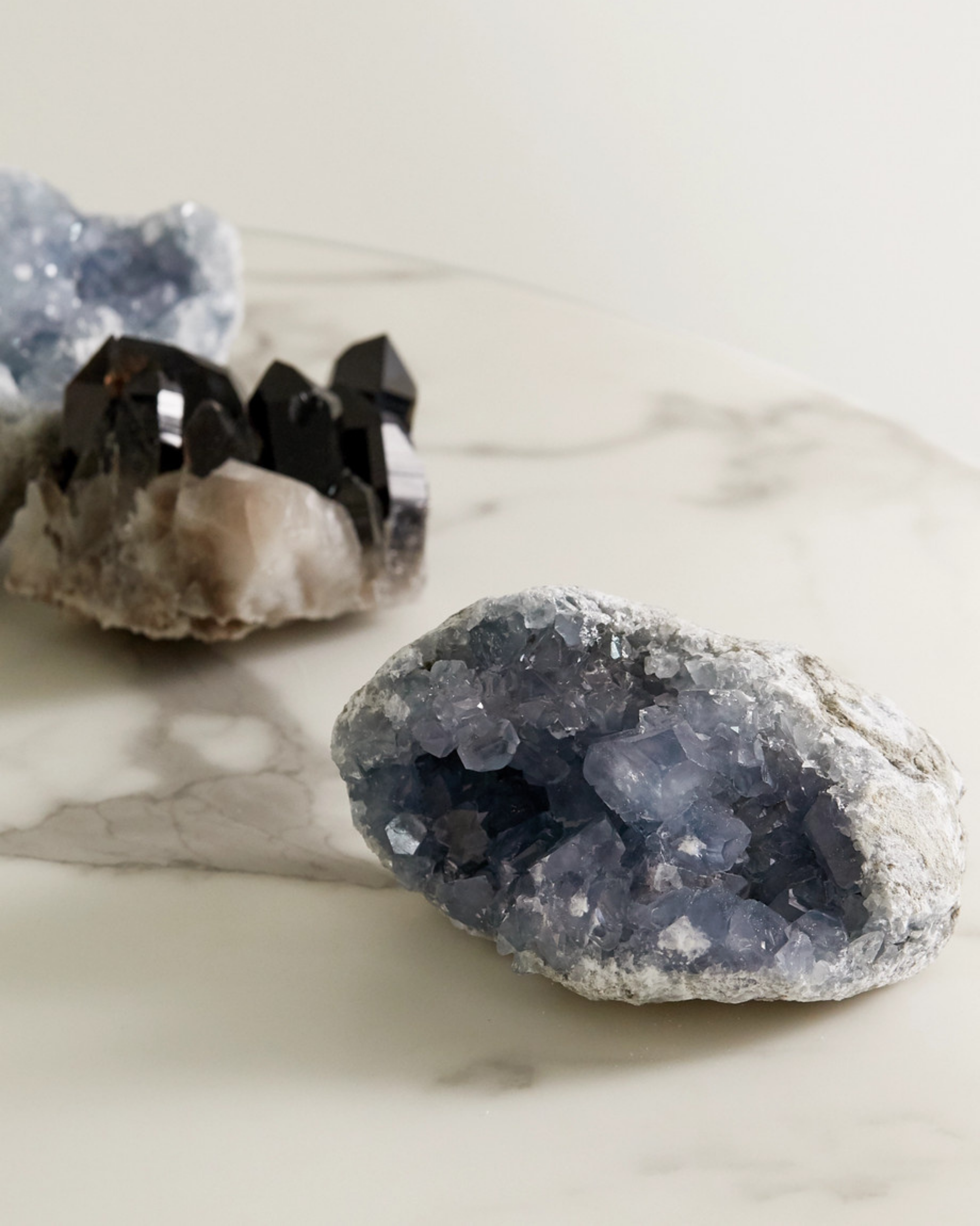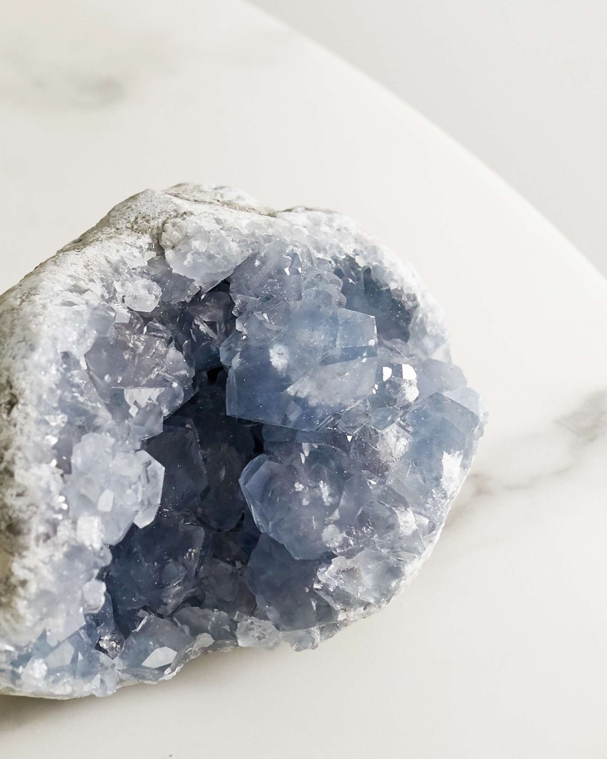 Celestine, also called Celestite, is derived from a latin word meaning "celestial," and inspired by the crystal's delicate shades of sky blue. It is fragile and typically placed around the home to bring peace, tranquility, and mindfulness into the space