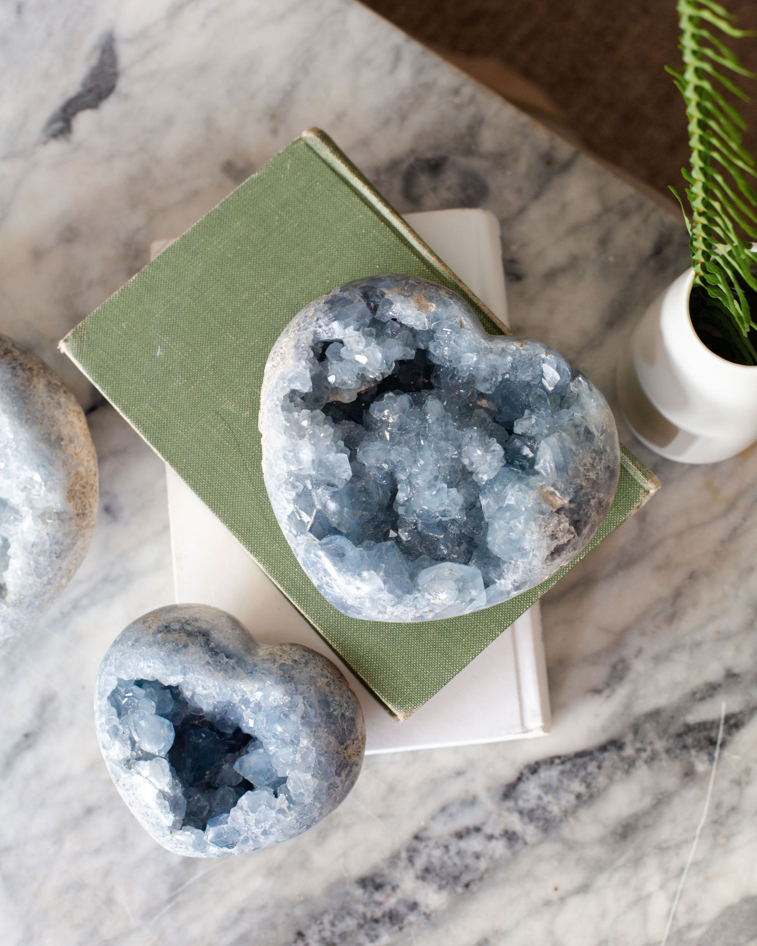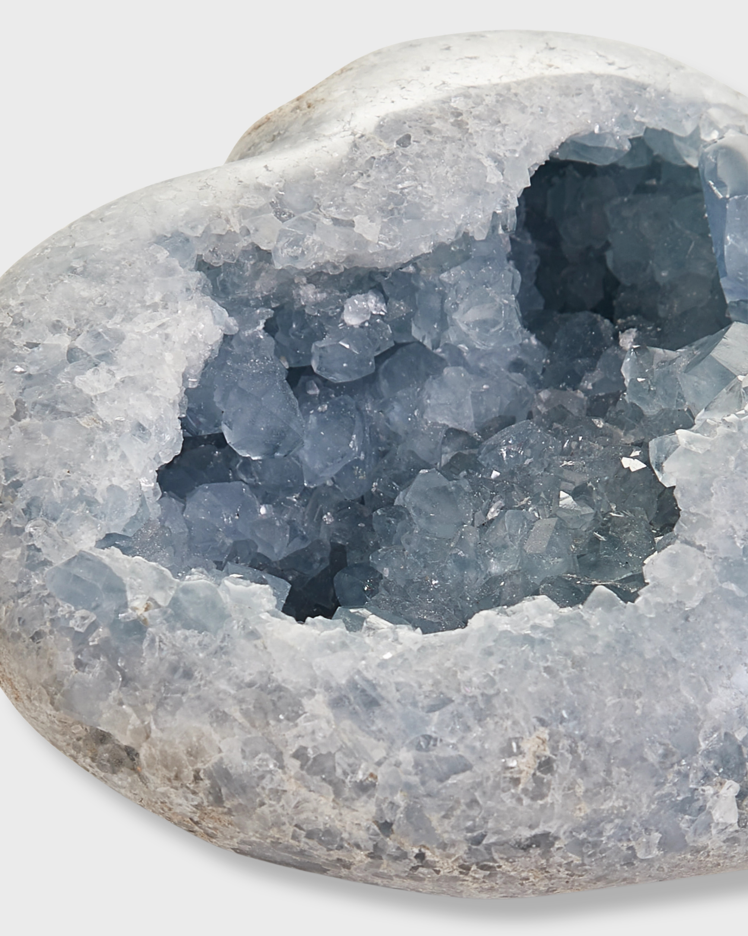 Celestine, also called Celestite, is derived from a latin word meaning "celestial," and inspired by the crystal's delicate shades of sky blue. It is fragile and typically placed around the home to bring peace, tranquility, and mindfulness into the space