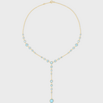 This Chakra Blue Topaz Round Lariat Necklace features an elegant design with shimmering blue topaz gemstones delicately arranged along a fine gold chain. The necklace's unique lariat style enhances its sophistication, with a single drop of blue topaz at the center, symbolizing balance and energy.
