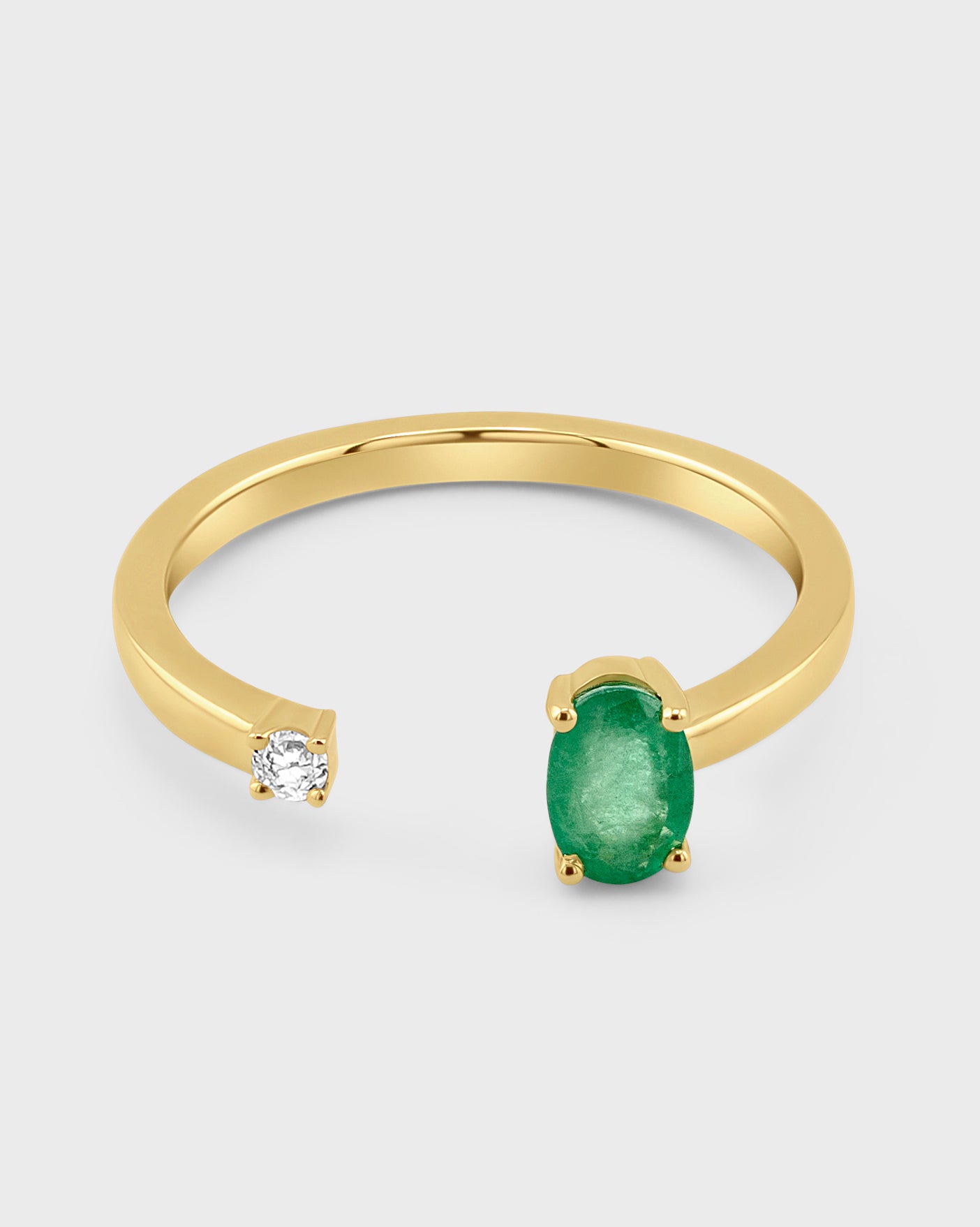 14 karat gold open ring features a vibrant emerald gemstone and diamond.