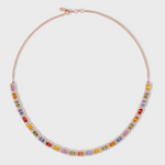 14k rose gold tennis necklace featuring a dazzling array of multicolored sapphires, each surrounded by a halo of sparkling diamonds meticulously handmade in NYC.
