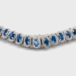 Oval-cut blue sapphires framed by sparkling diamonds, set in silver. This collar is handcrafted in the heart of New York City.