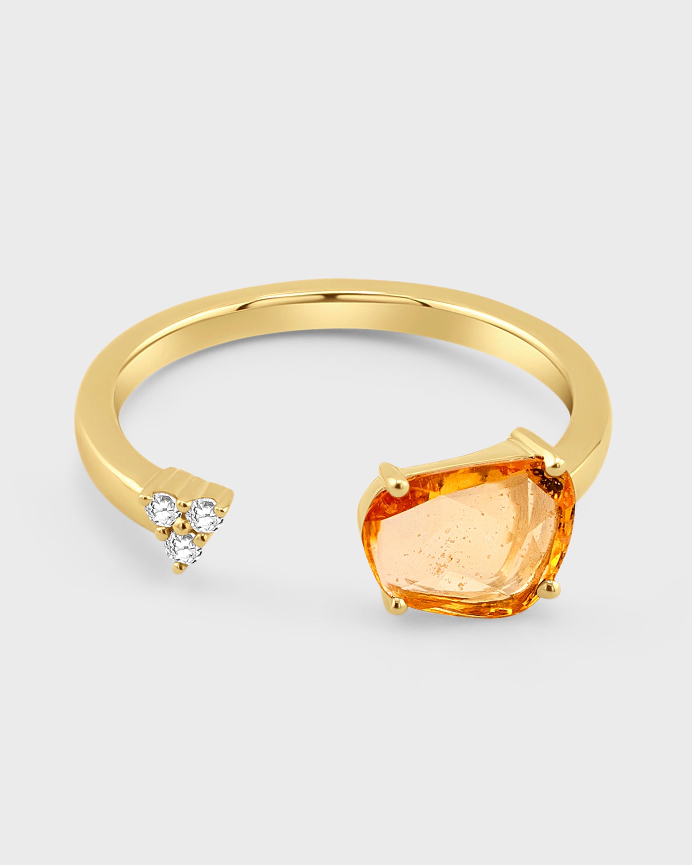 A stunning piece handcrafted in NYC. This 14k gold ring features a vibrant yellow sapphire offset by a delicate trio of diamonds. The open design creates a modern, eye-catching look perfect for everyday elegance or special occasions. A unique addition to any jewelry collection.