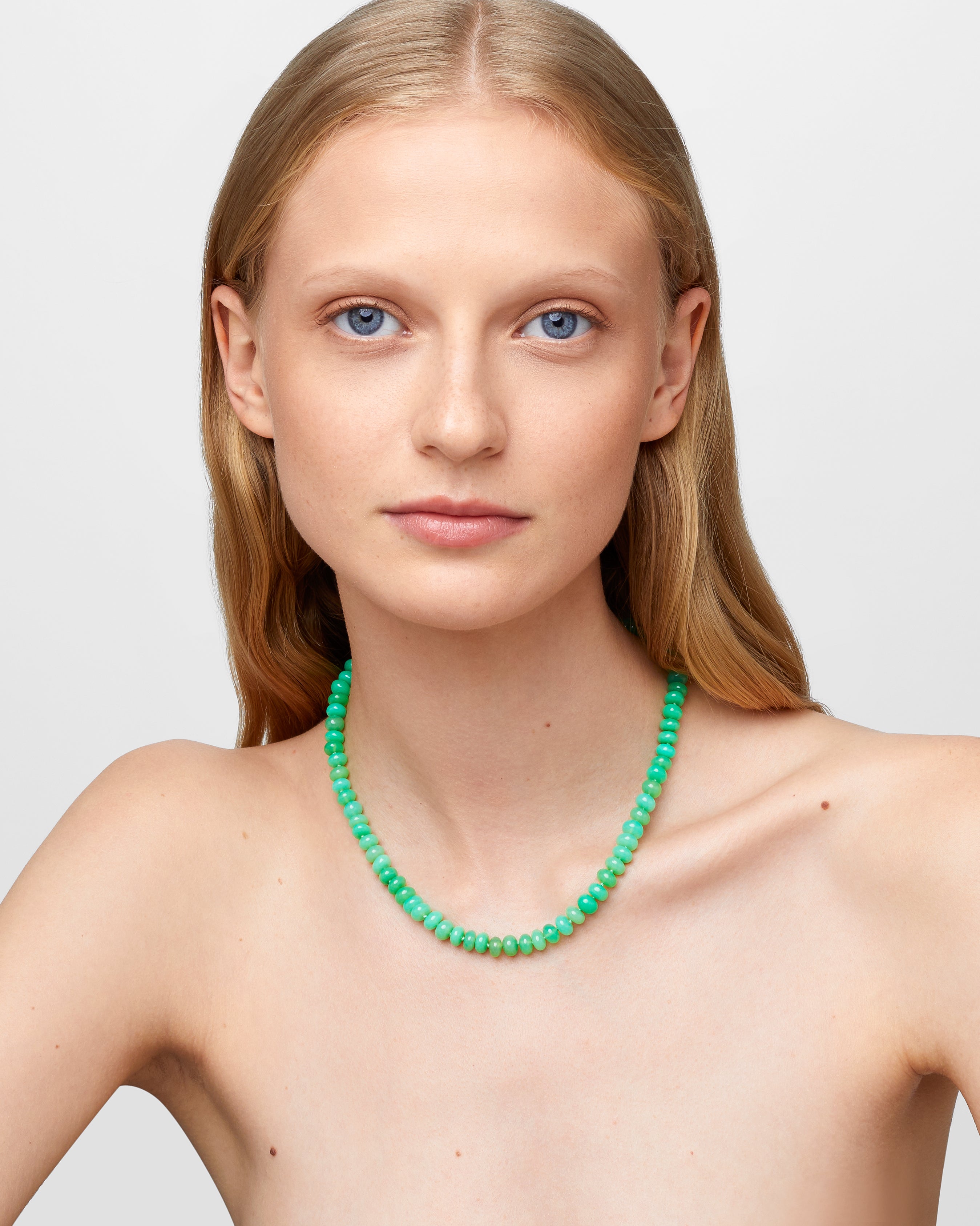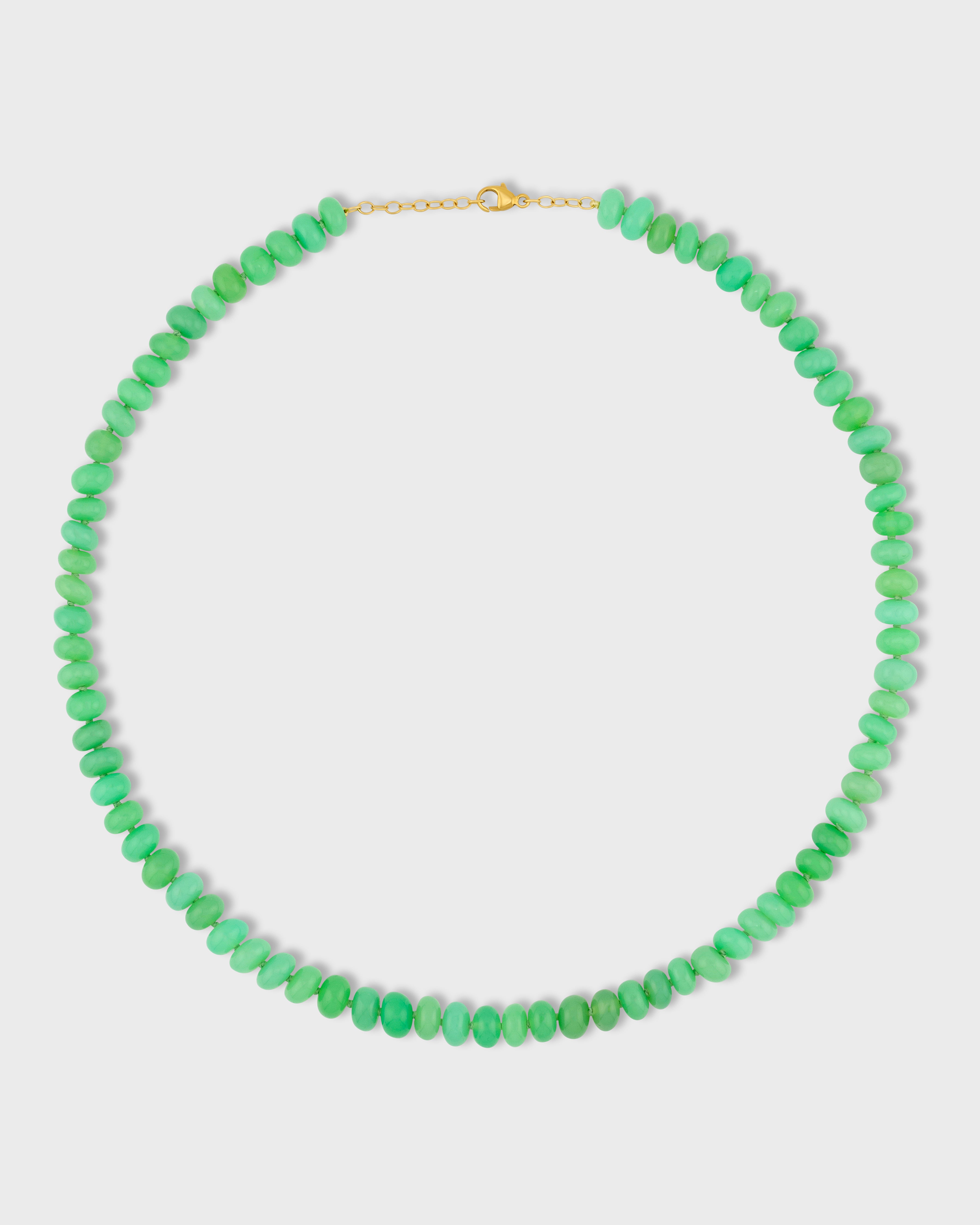 The Oracle Chrysoprase Crystal Necklace features vibrant green chrysoprase beads, each carefully strung together to create a serene and natural aesthetic. The piece is finished with a gold clasp, offering a timeless elegance that symbolizes healing and transformation.