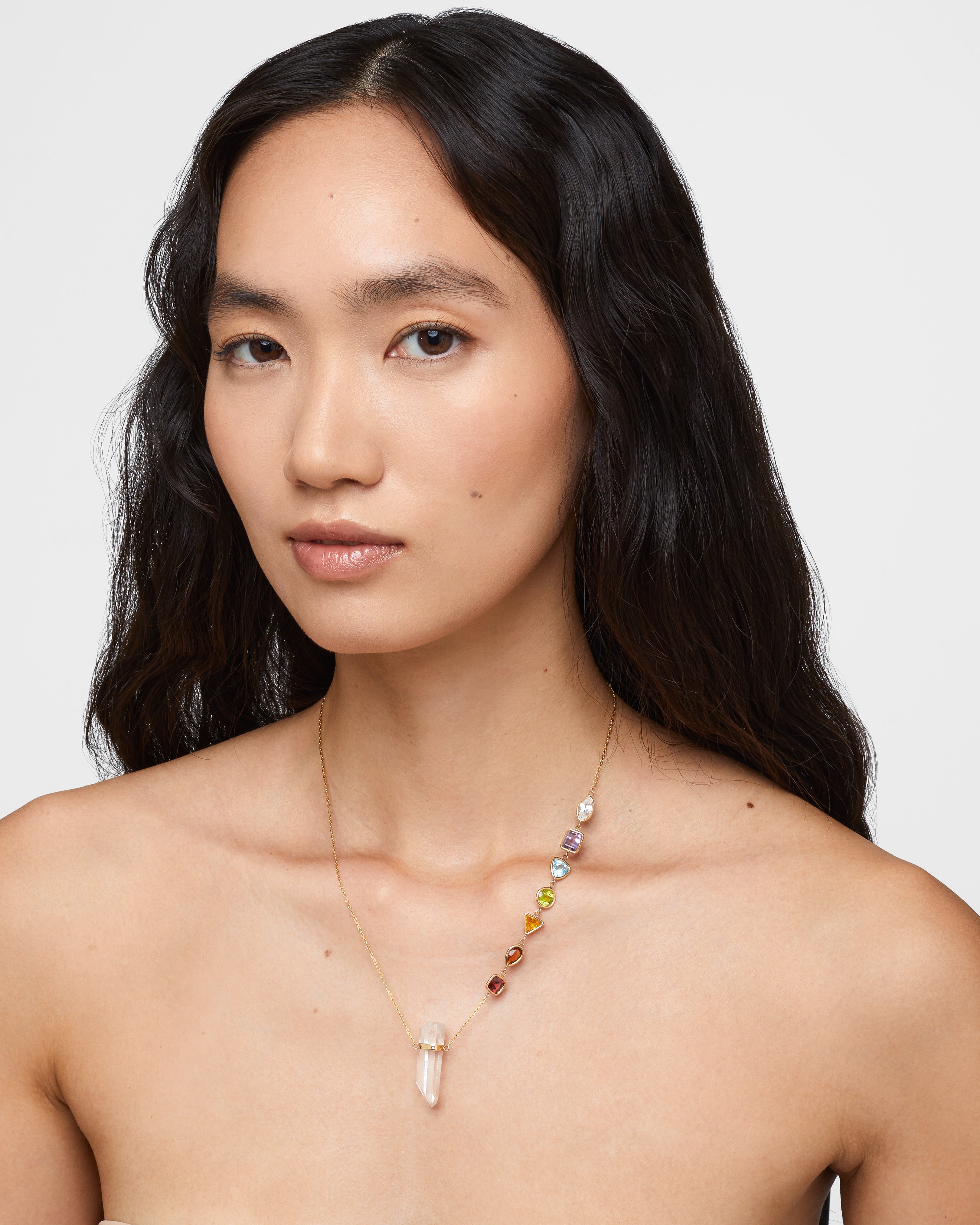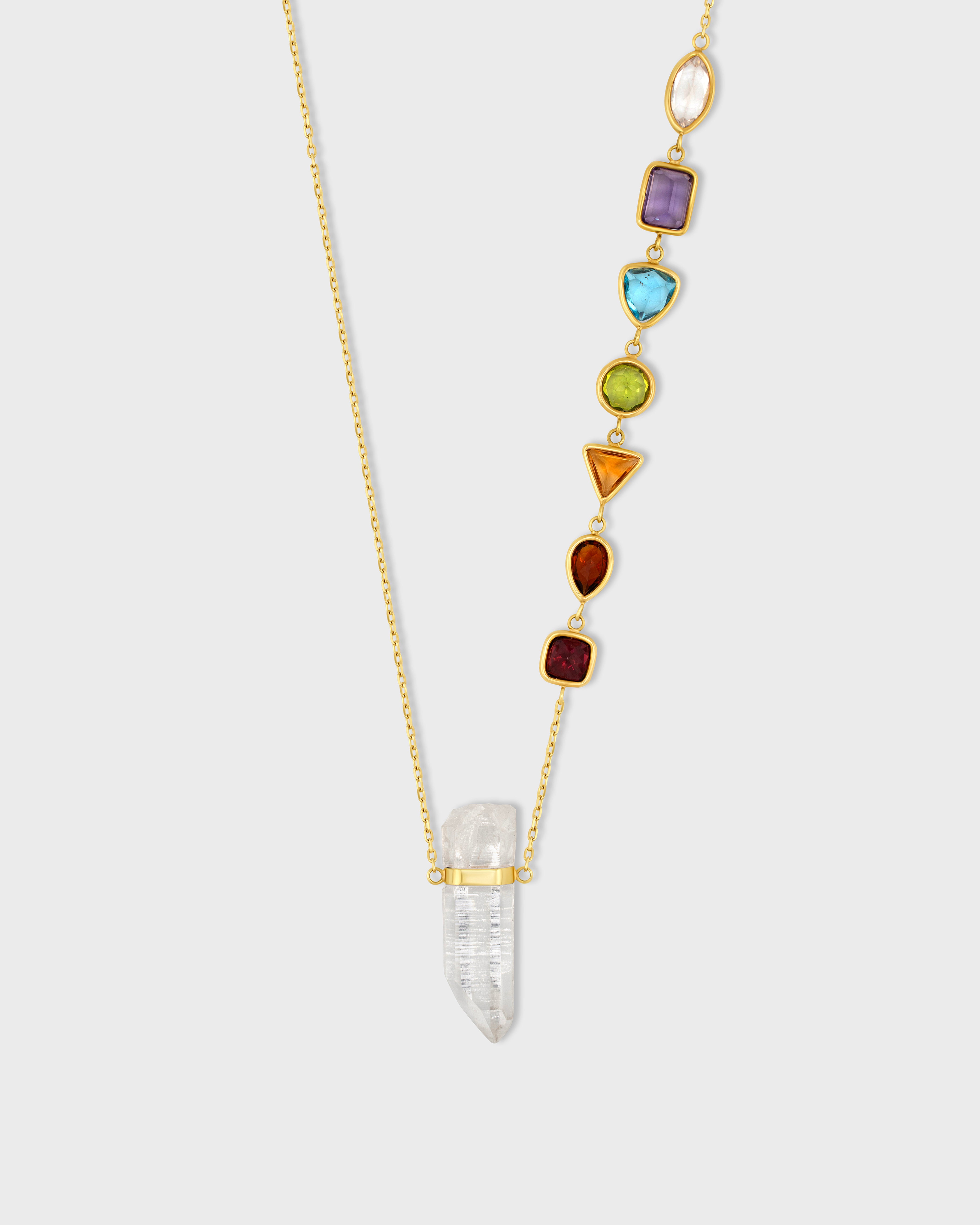 Master of all healing crystals, our clear crystal quartz is custom hand set to the natural shape of the stone in 14 karat yellow gold on Italian gold chain. A combination that symbolize our chakra system line up the left side including one of a kind gemstones. Truly one of a kind piece, created to attune to the vibration of each individual wearer