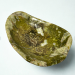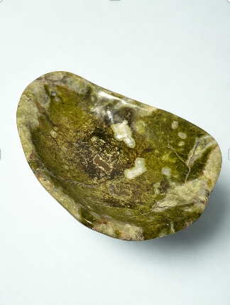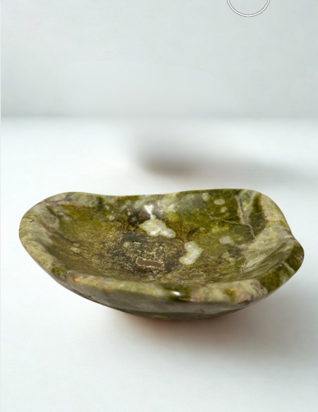 Hand-carved from natural green serpentine, this organically shaped bowl features earthy tones and unique veining. Revered for its grounding and rejuvenating properties, it’s a beautiful vessel for displaying crystals, jewelry, or other cherished objects, inviting balance and renewal into any space.