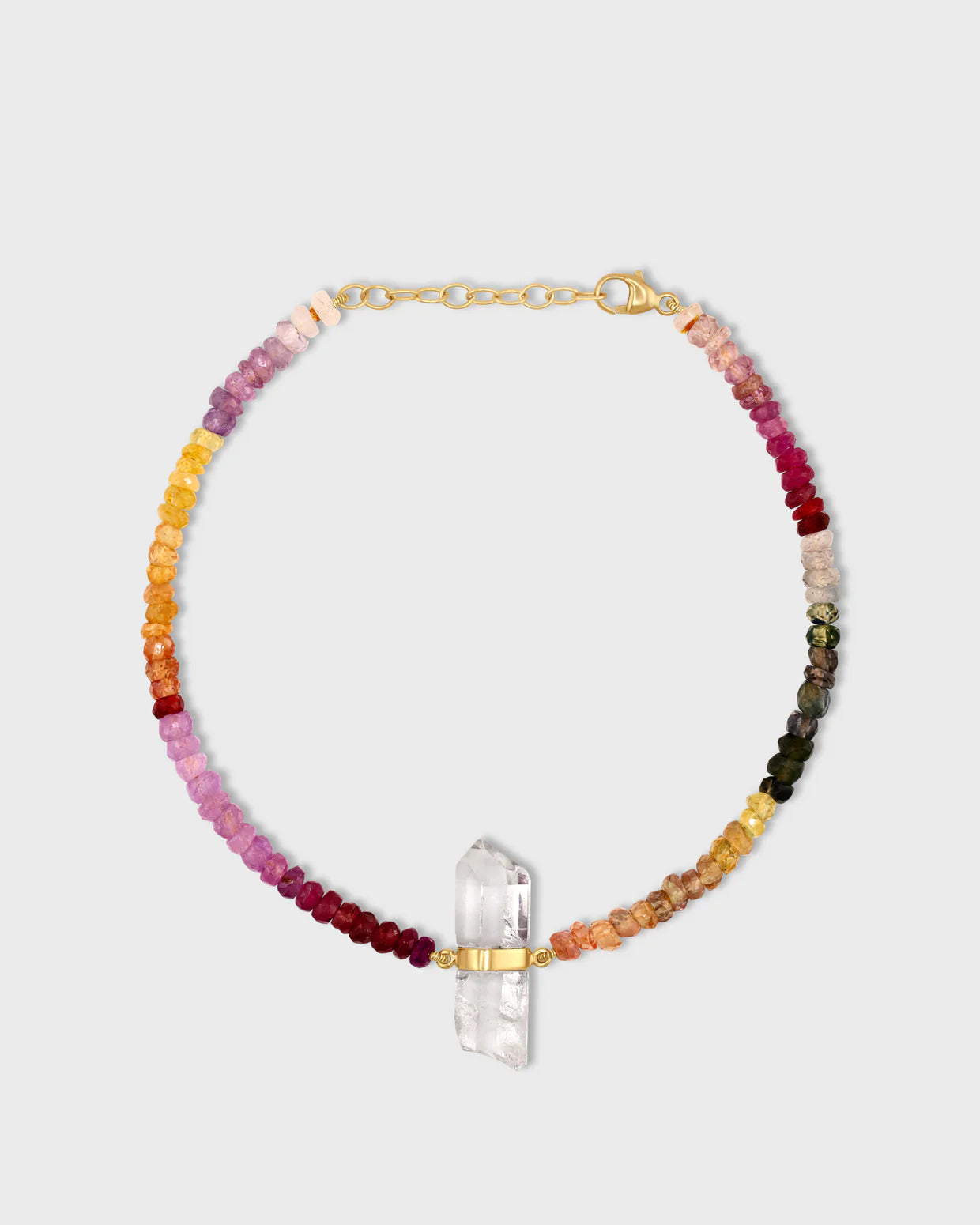 Rainbow sapphire bracelet with a clear crystal quartz charm custom handset in 14 karat gold in our New York City workshop. Each crystal is one-of-a-kind with natural clarity and shapes that attune to vibrational needs of the beholder.