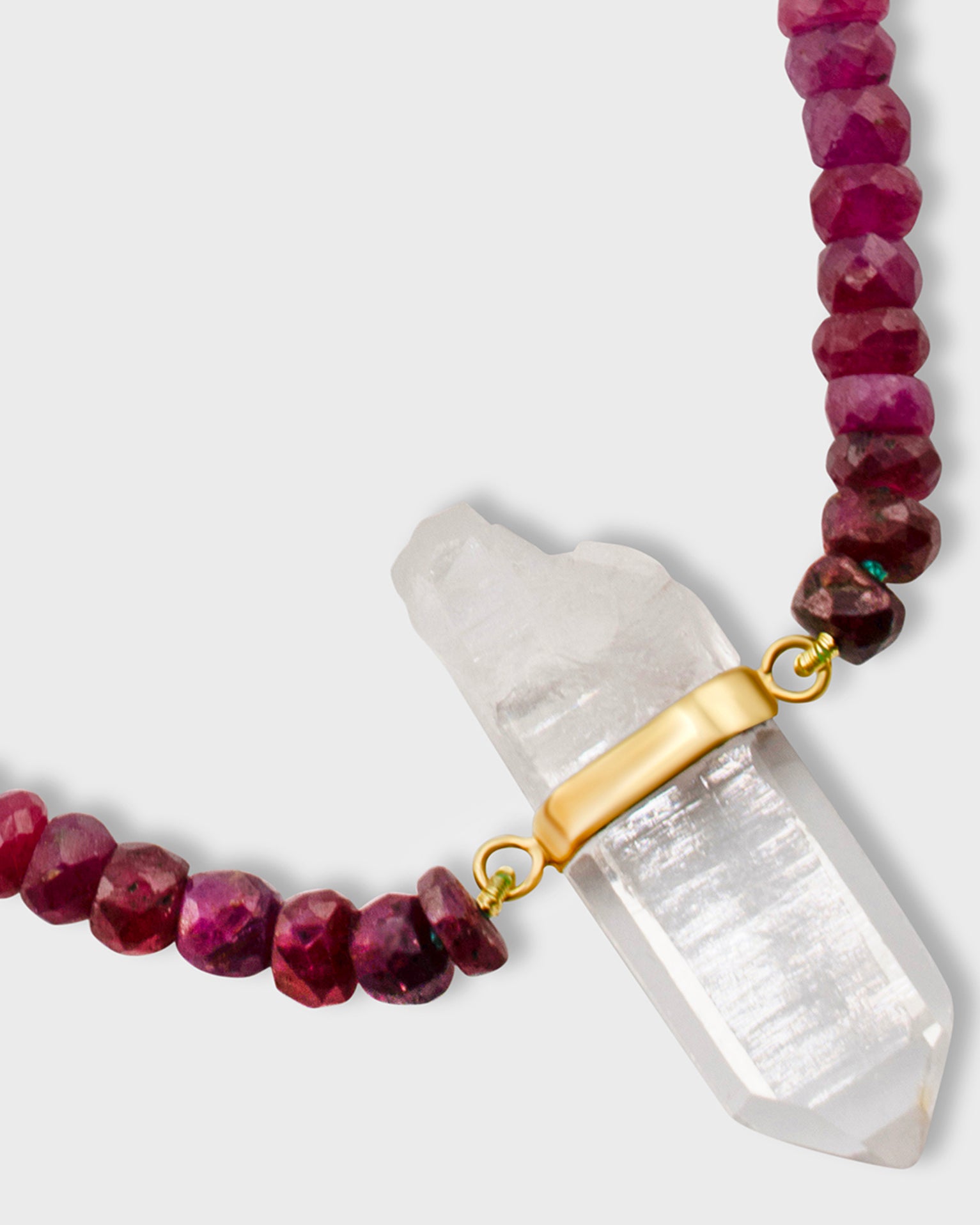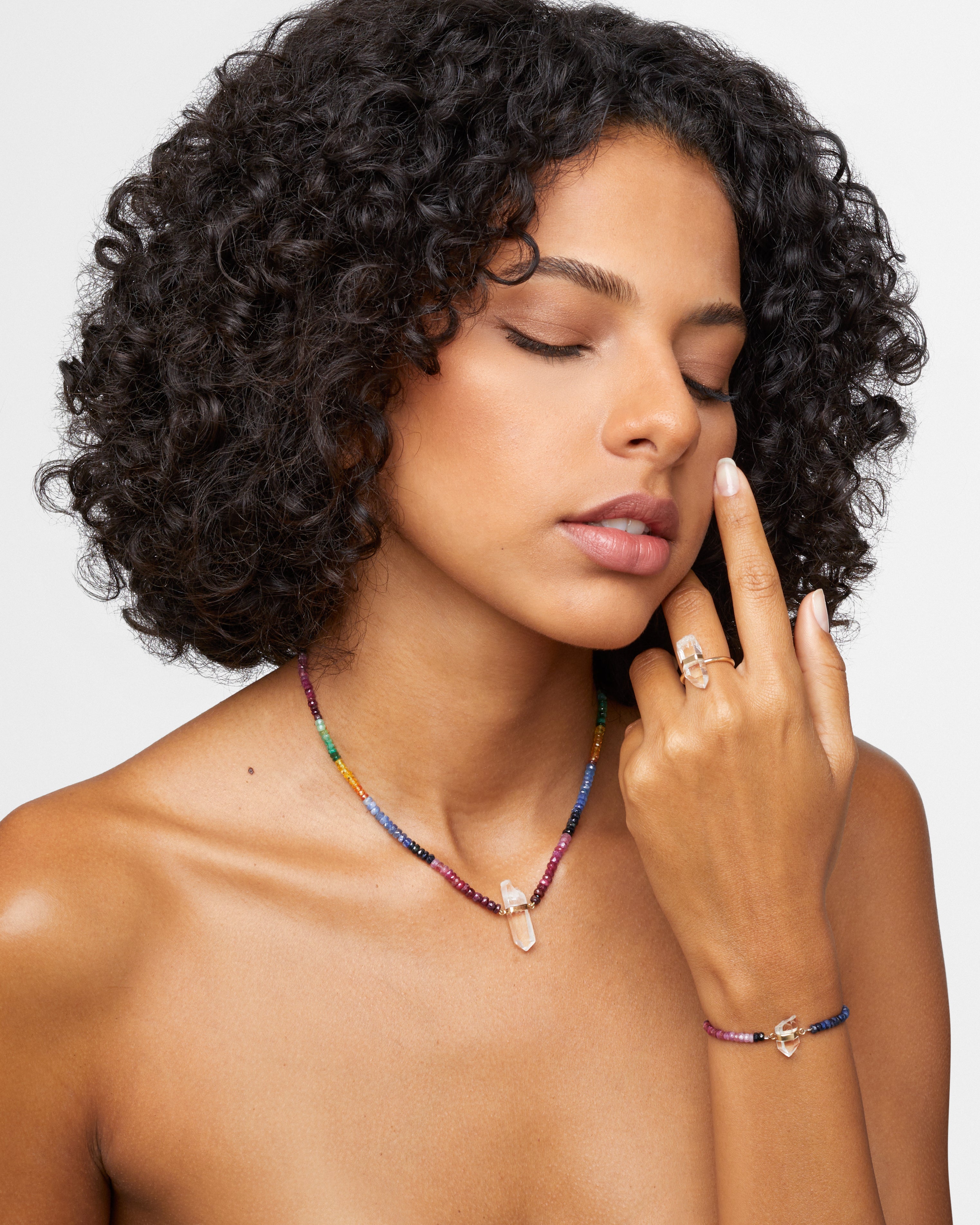 Inspired by the Arizona desert, this necklace combines dark rainbow sapphires with crystal quartz and a gold bar. The piece is a perfect balance of earthy hues and celestial elegance, symbolizing strength and transformation.