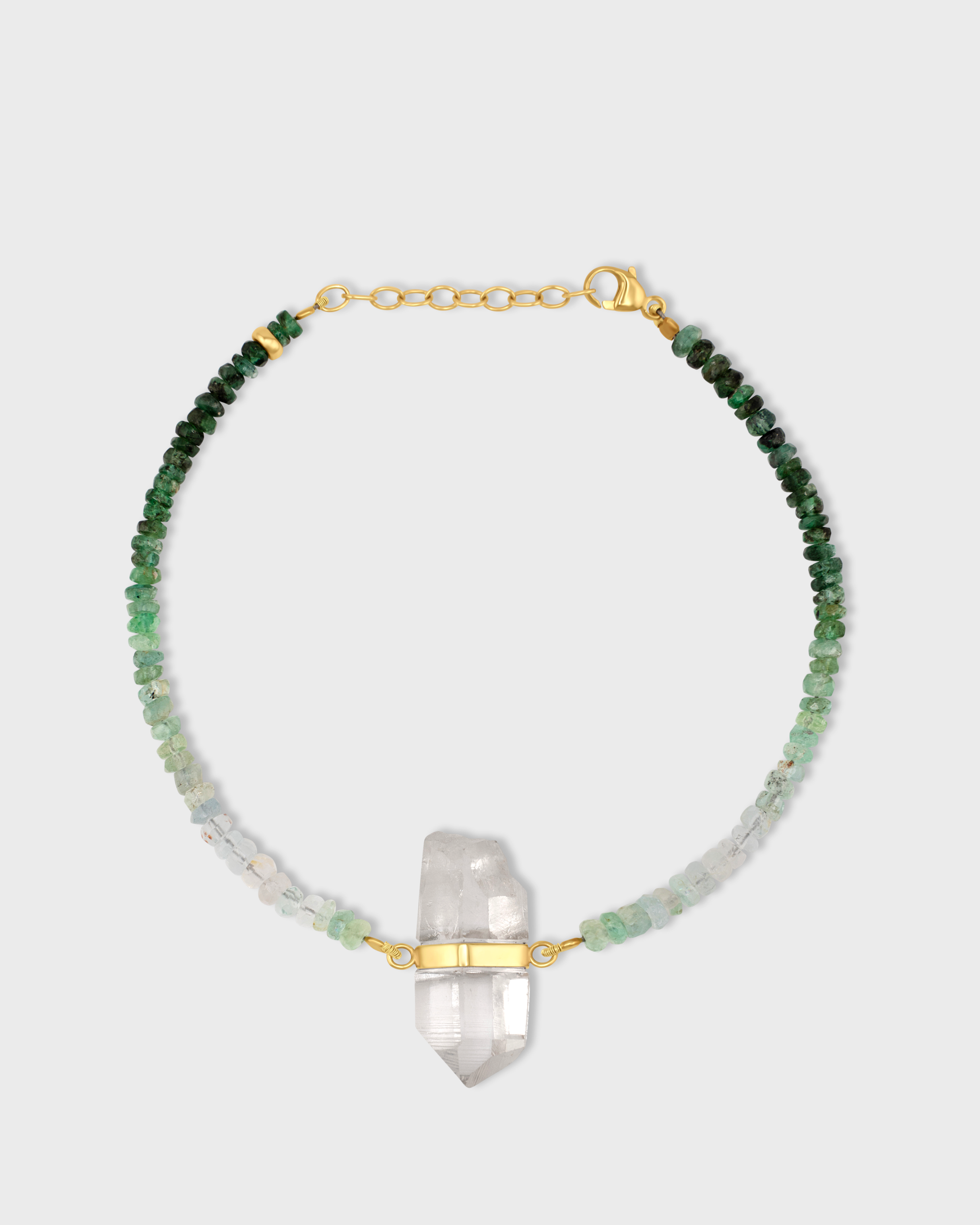 Emerald hand beaded bracelet with a clear crystal quartz charm custom handset in 14 karat gold in our New York City workshop. Each crystal is one-of-a-kind with natural clarity and shapes that attune to vibrational needs of the beholder.