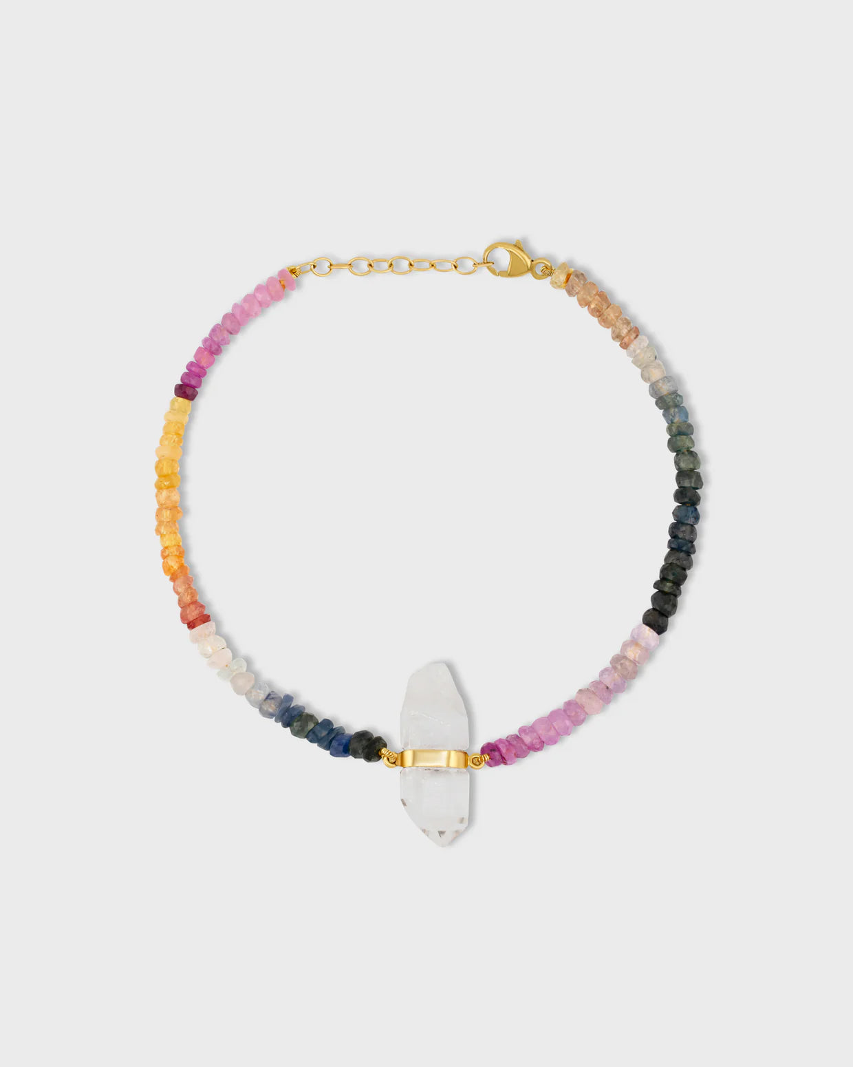A delicate rainbow of light-hued sapphires complemented by a clear crystal charm. This bracelet exudes lightness and positivity, ideal for uplifting your everyday style.