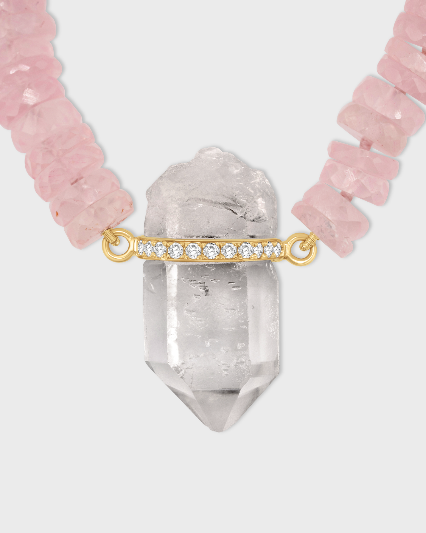 This necklace is an elegant combination of rose quartz and crystal quartz, enhanced with a diamond-accented charm. The necklace features a string of soft pink rose quartz beads, each with a faceted, rounded shape. A horizontal bar set with small, sparkling diamonds in gold wraps around the top of the crystal quartz, adding a subtle touch of luxury and sophistication.