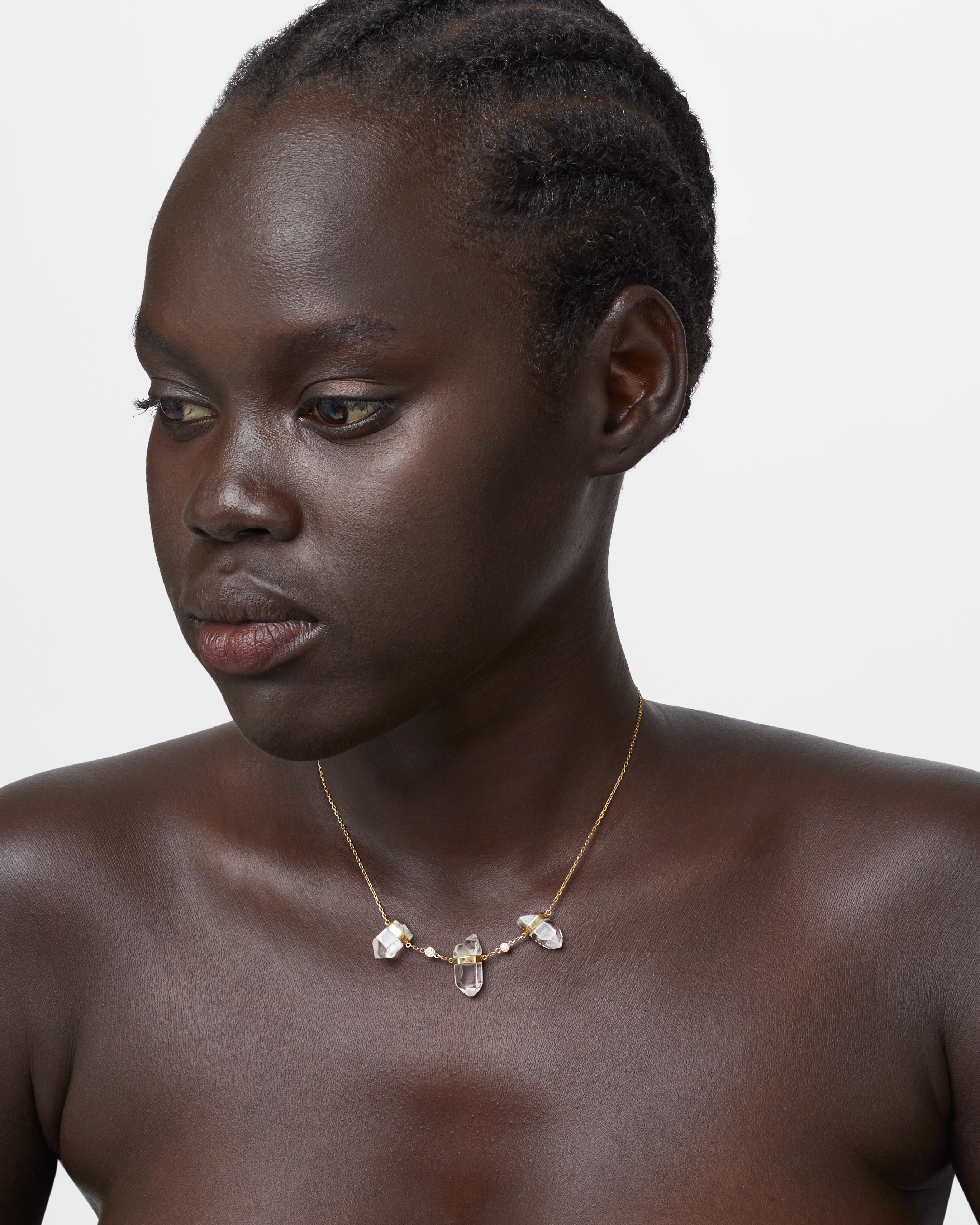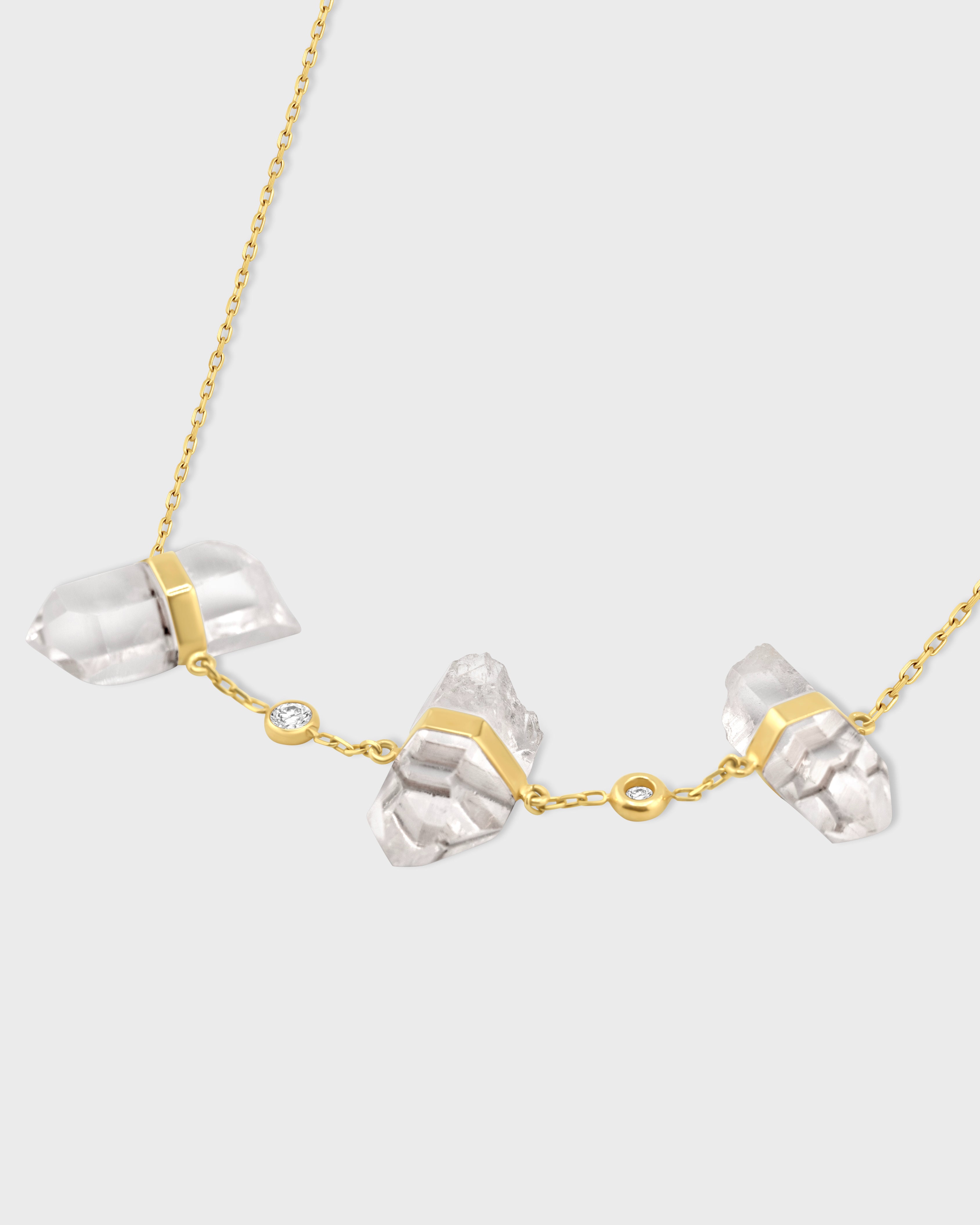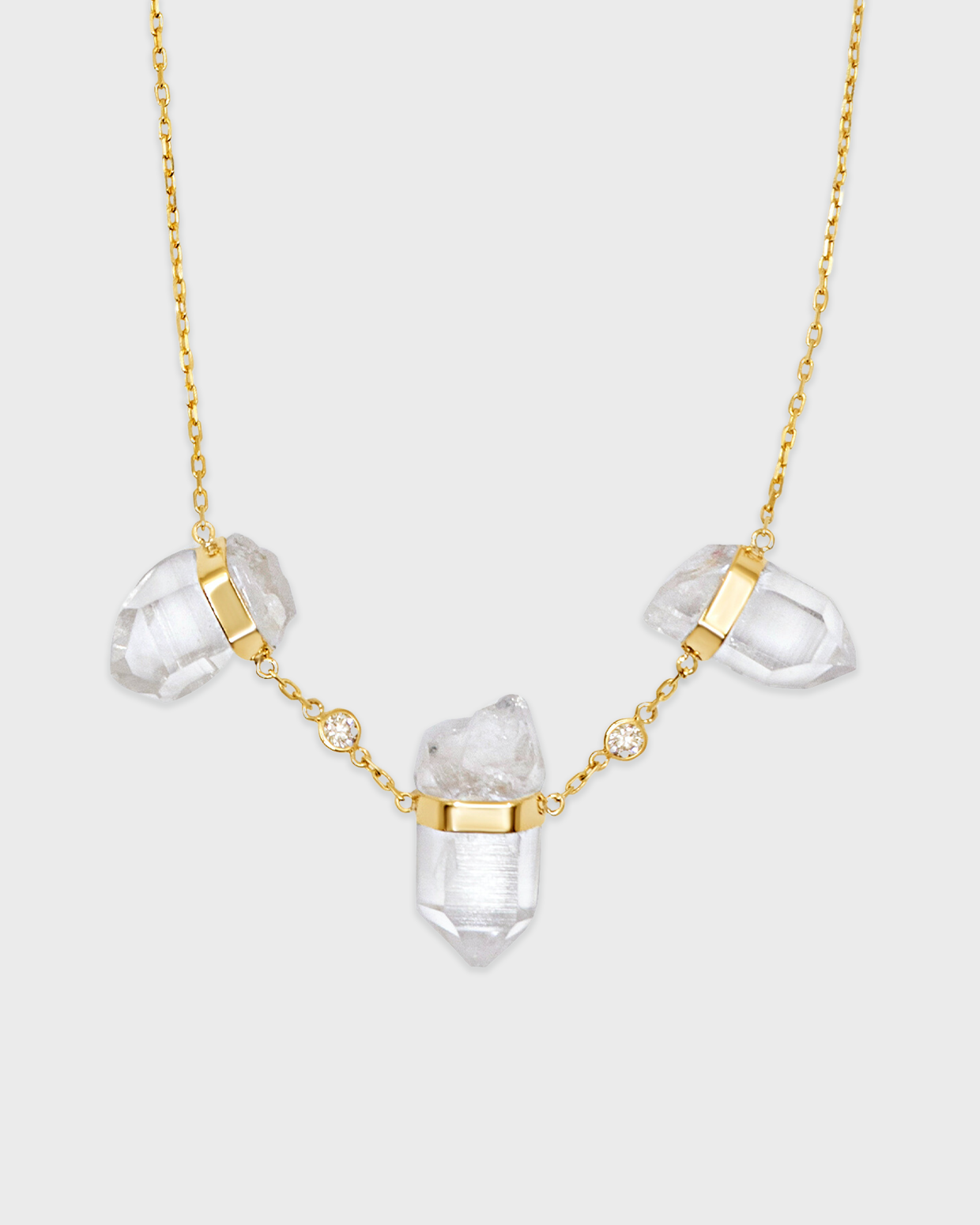 Three crystal quartz set with a gold bar adorned with diamond bezels between each crystal. Elegant to layer or to wear on its own. Master of all healing crystals, our clear crystal quartz is custom hand set to the natural shape of the stone in 14 karat yellow gold on Italian gold chain. Truly one of a kind piece, created to attune to the vibration of each individual wearer.