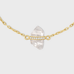 A custom-set crystal quartz centerpiece on a sleek gold chain. The centerpiece is accented with a diamond-studded bar, adding a touch of sparkle and elegance.