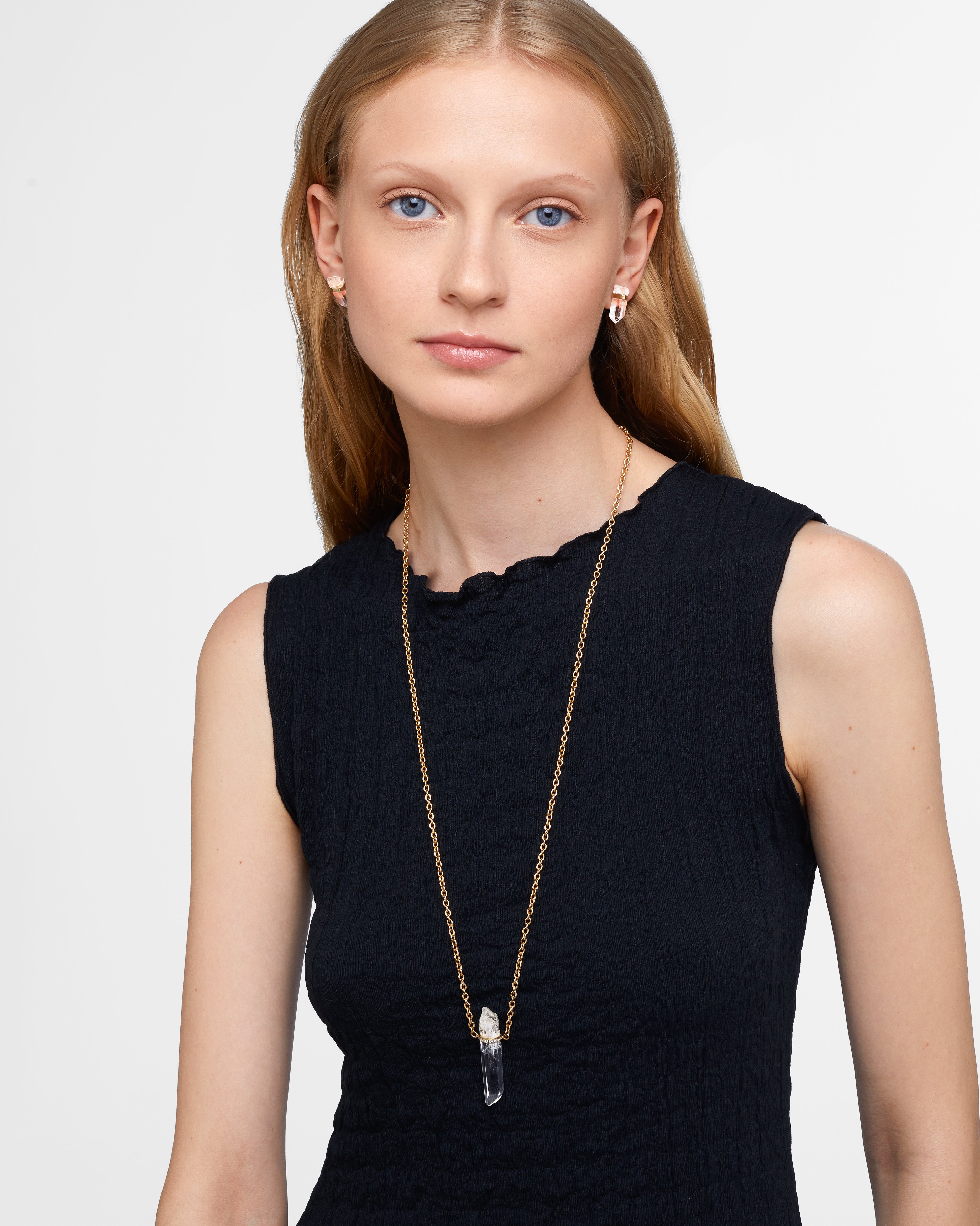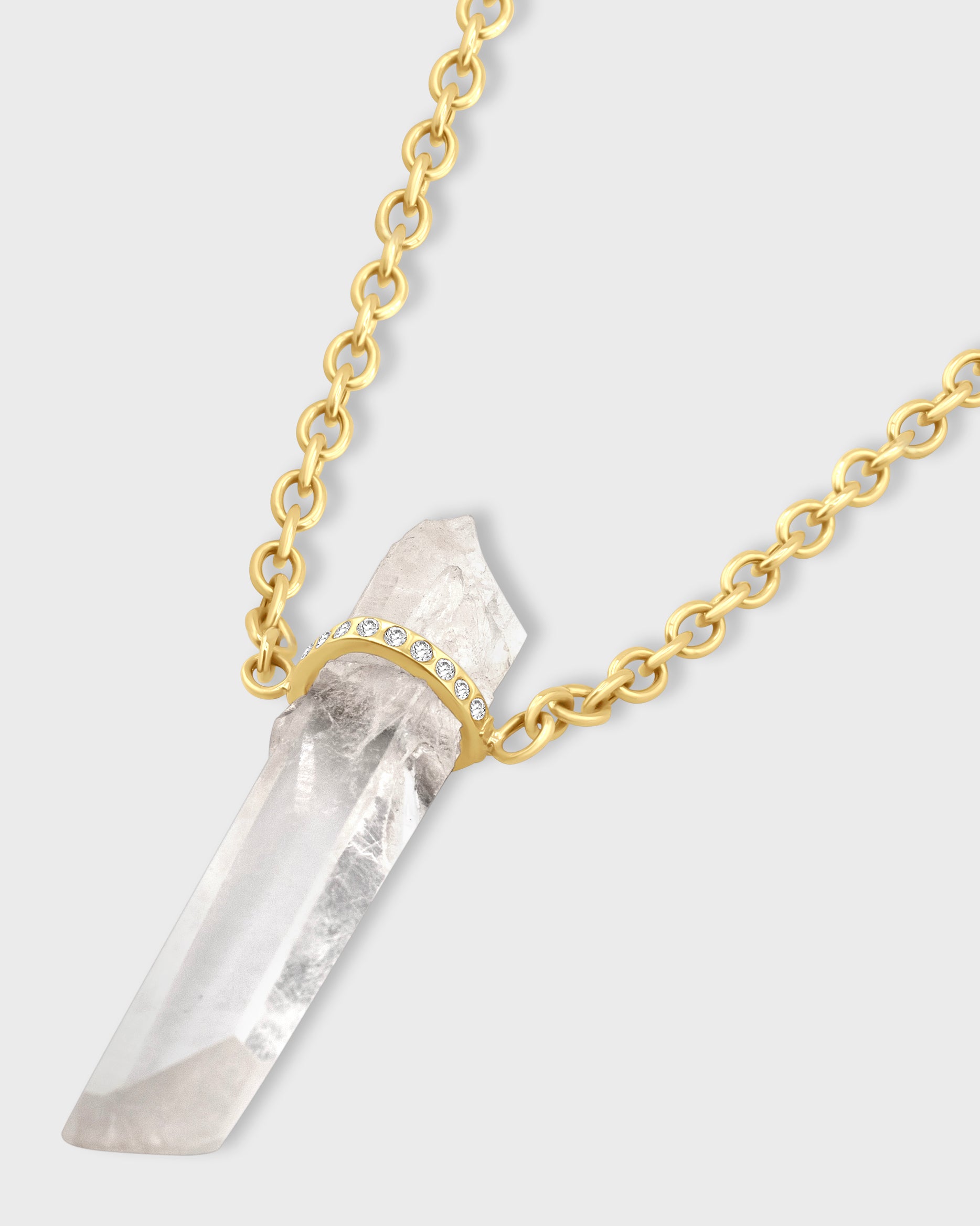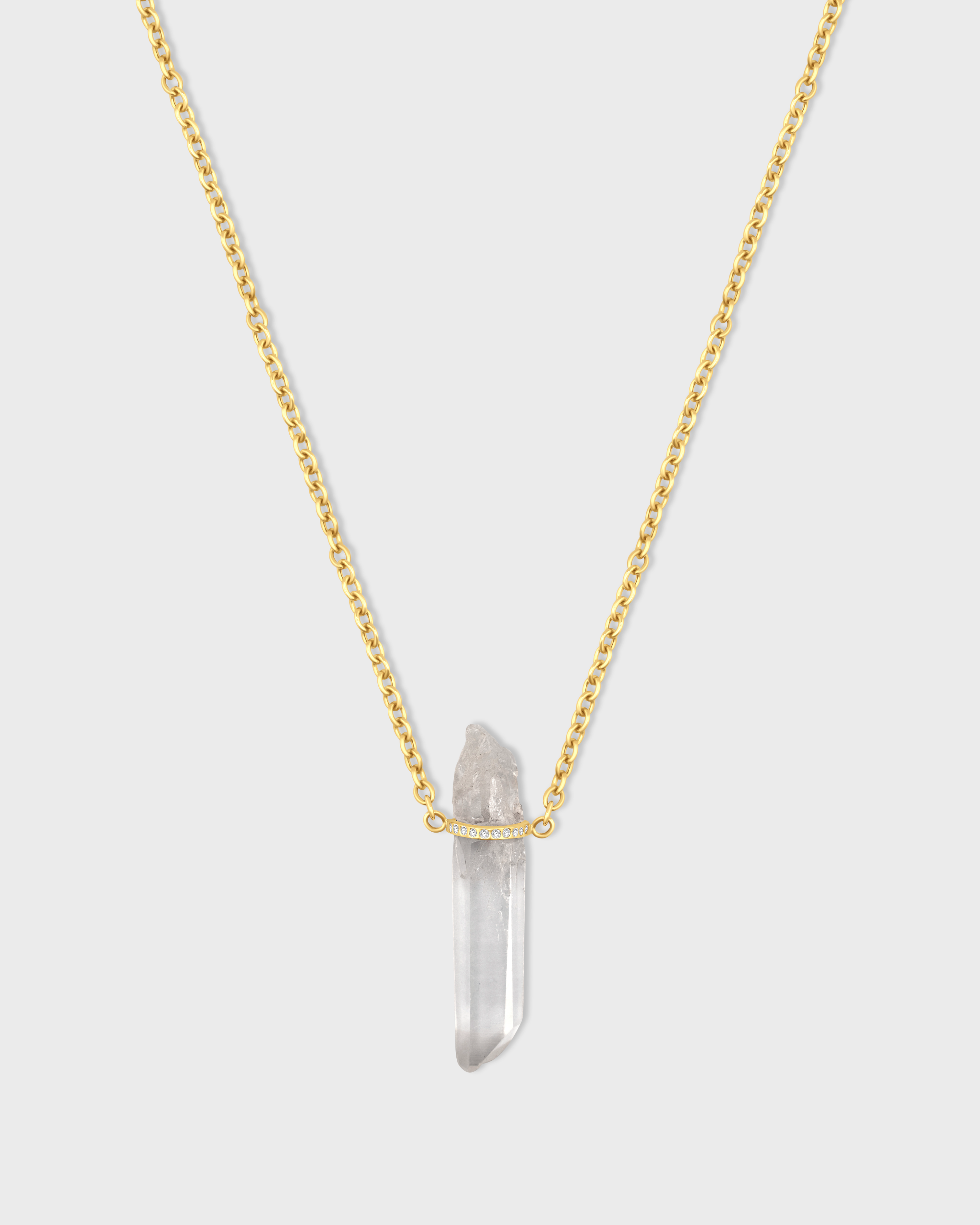 Master of all healing crystals, our clear crystal quartz is custom hand set to the natural shape of the stone in 14 karat yellow gold on Italian gold chain. Truly one of a kind piece, created to attune to the vibration of each individual wearer.