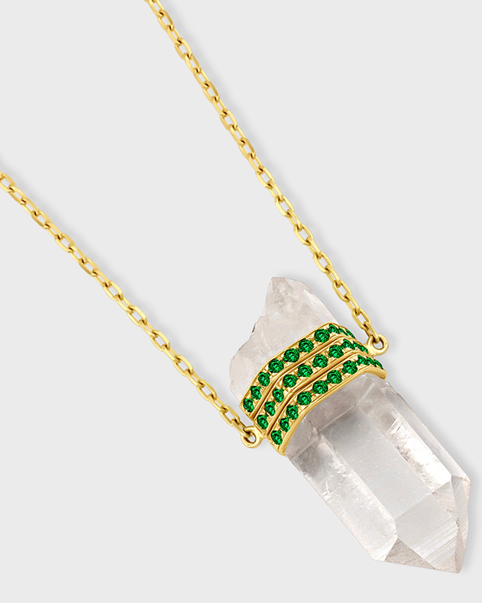 One of a kind crystal quartz custom hand set in three rows of emeralds and 14 karat gold to the shape of the crystal. Made in New York City.