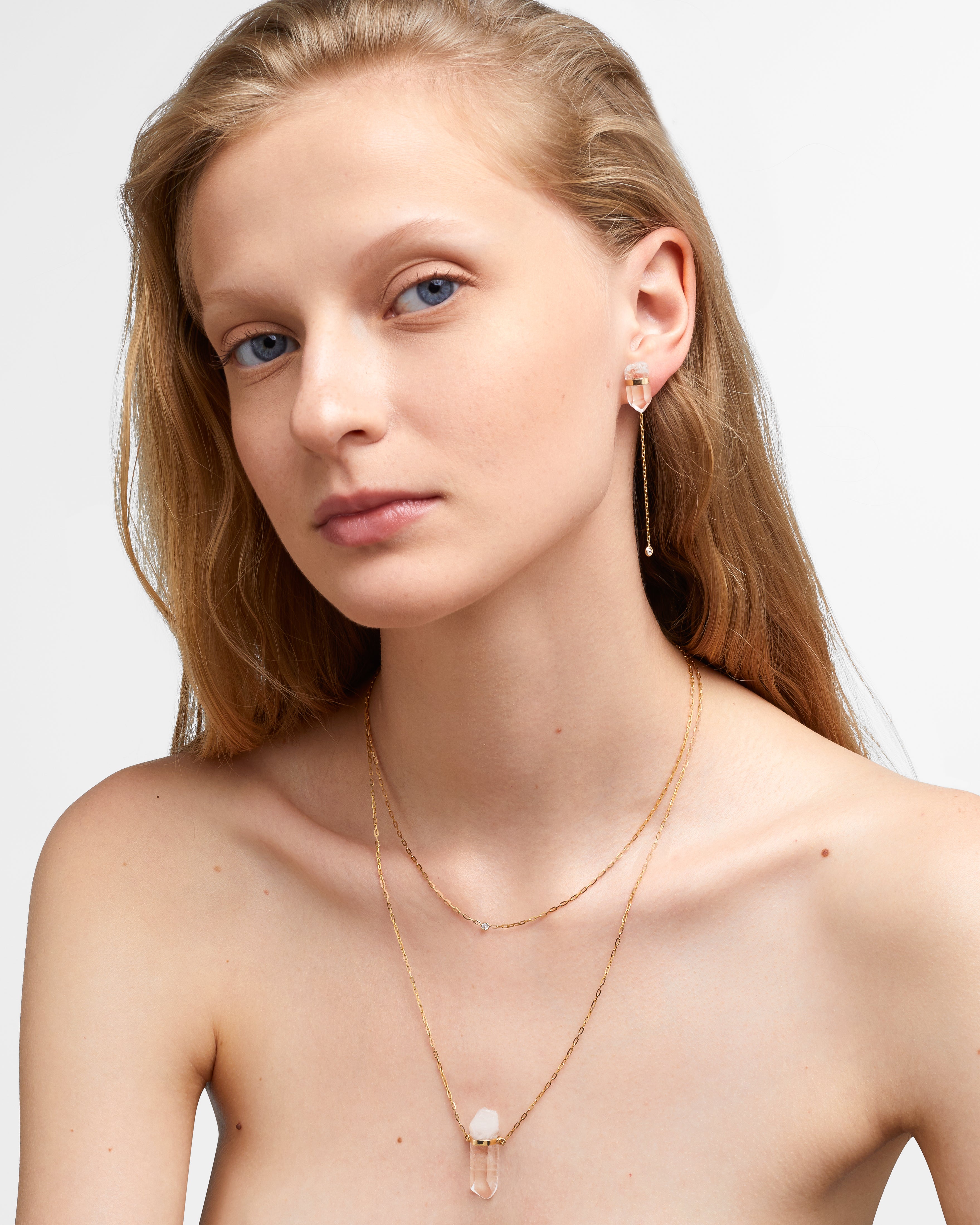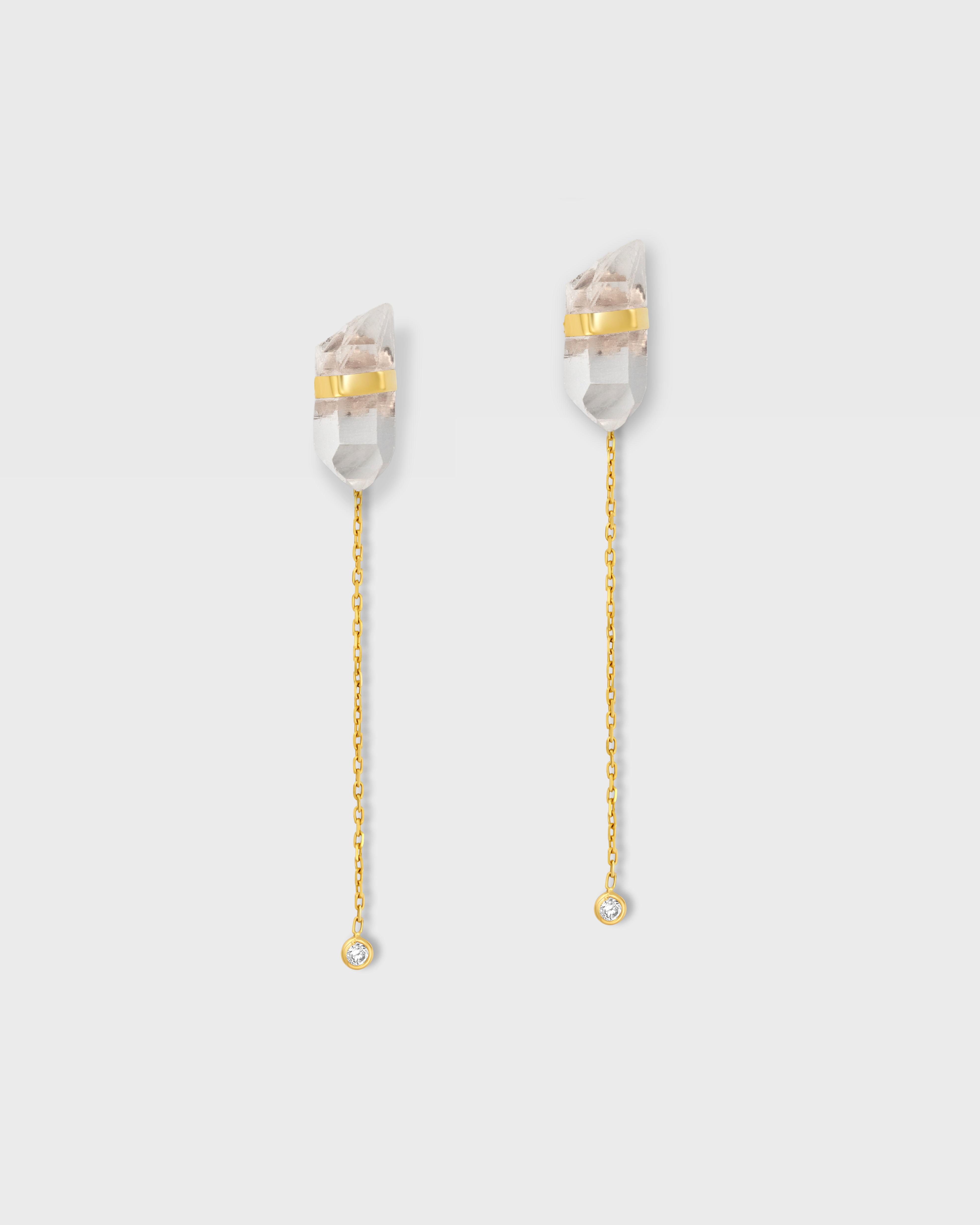 Our signature Crystal Quartz custom hand set earring with diamond bezel gold chain drop earring back. The diamond drop backing can be interchangeable with any earring.
