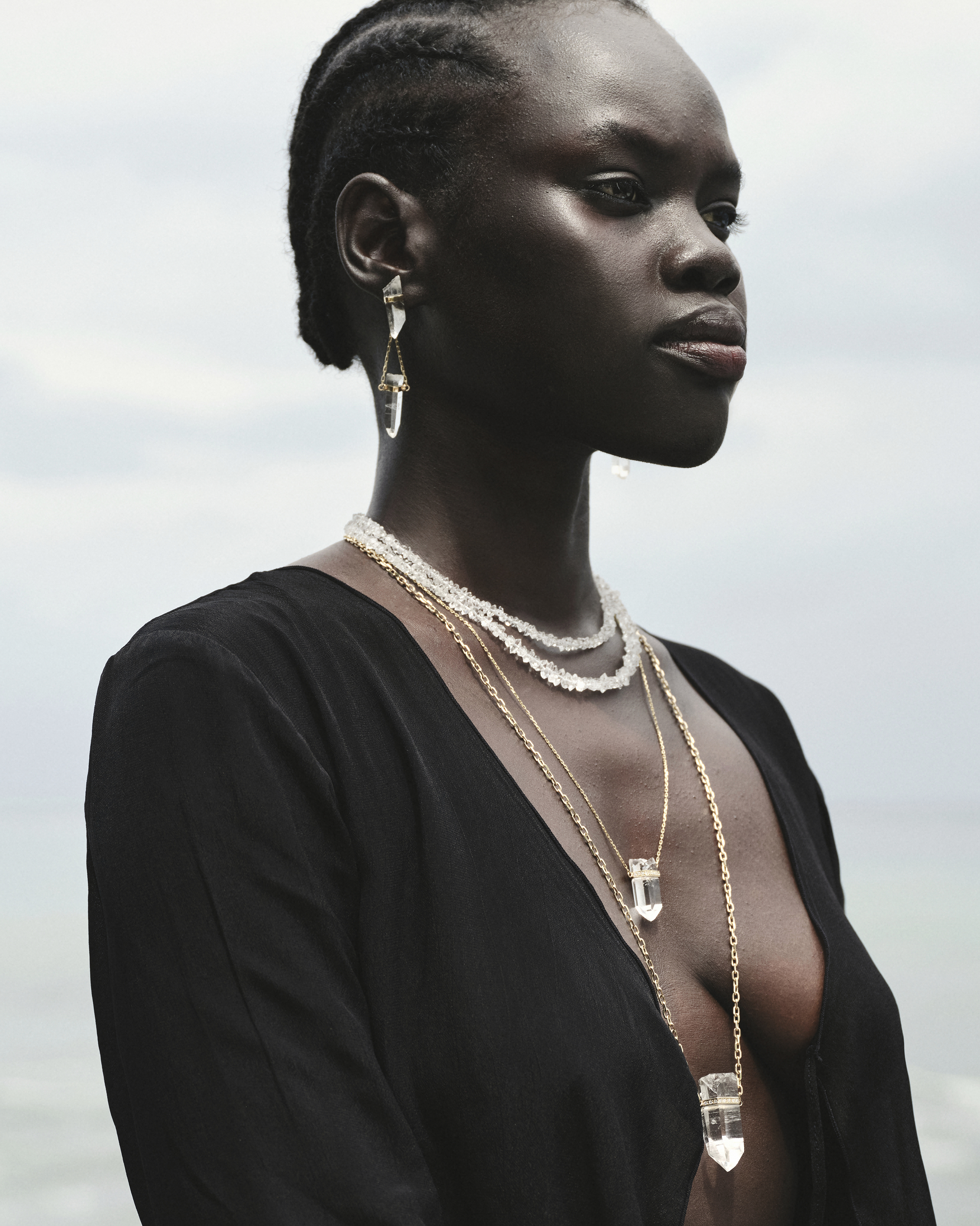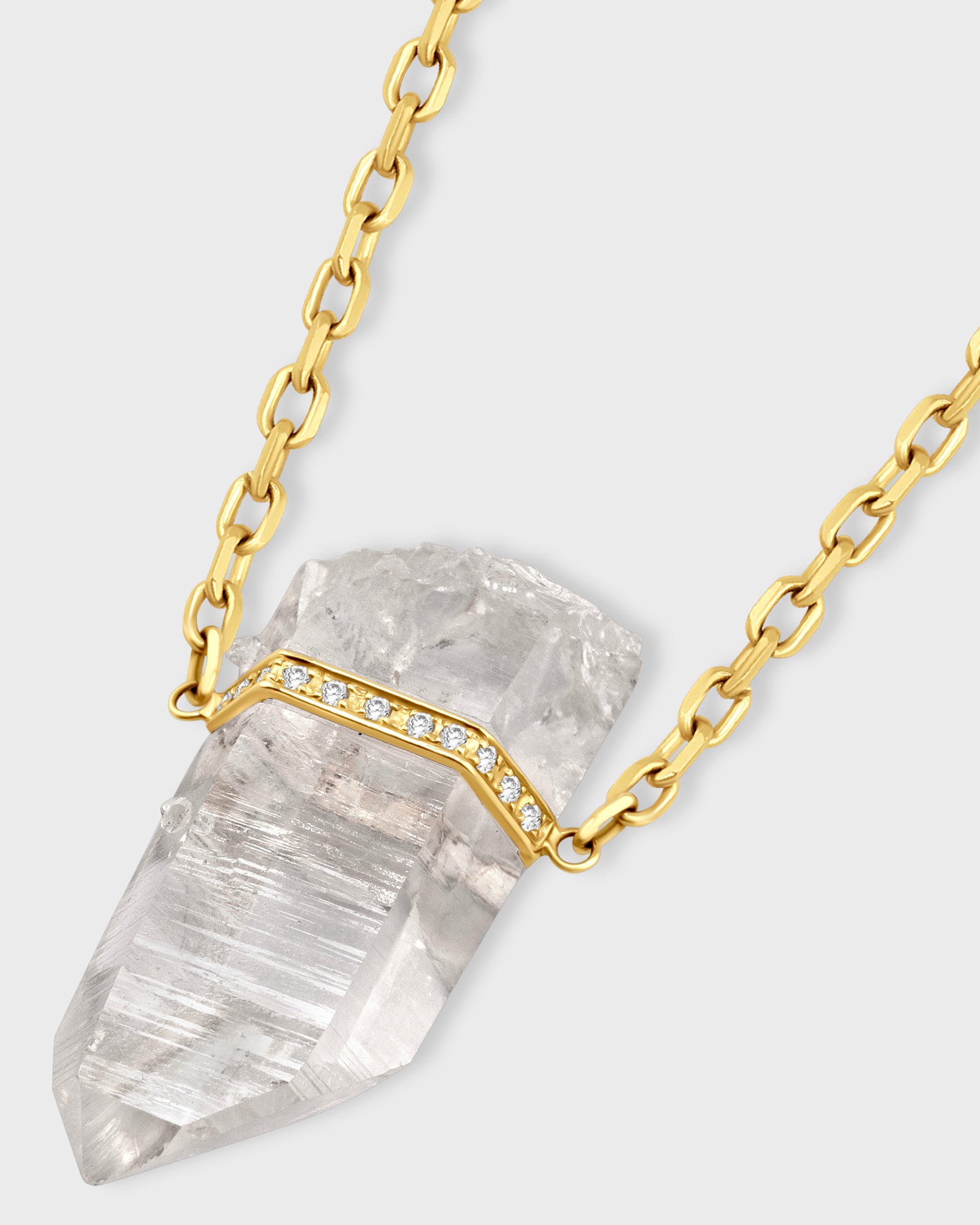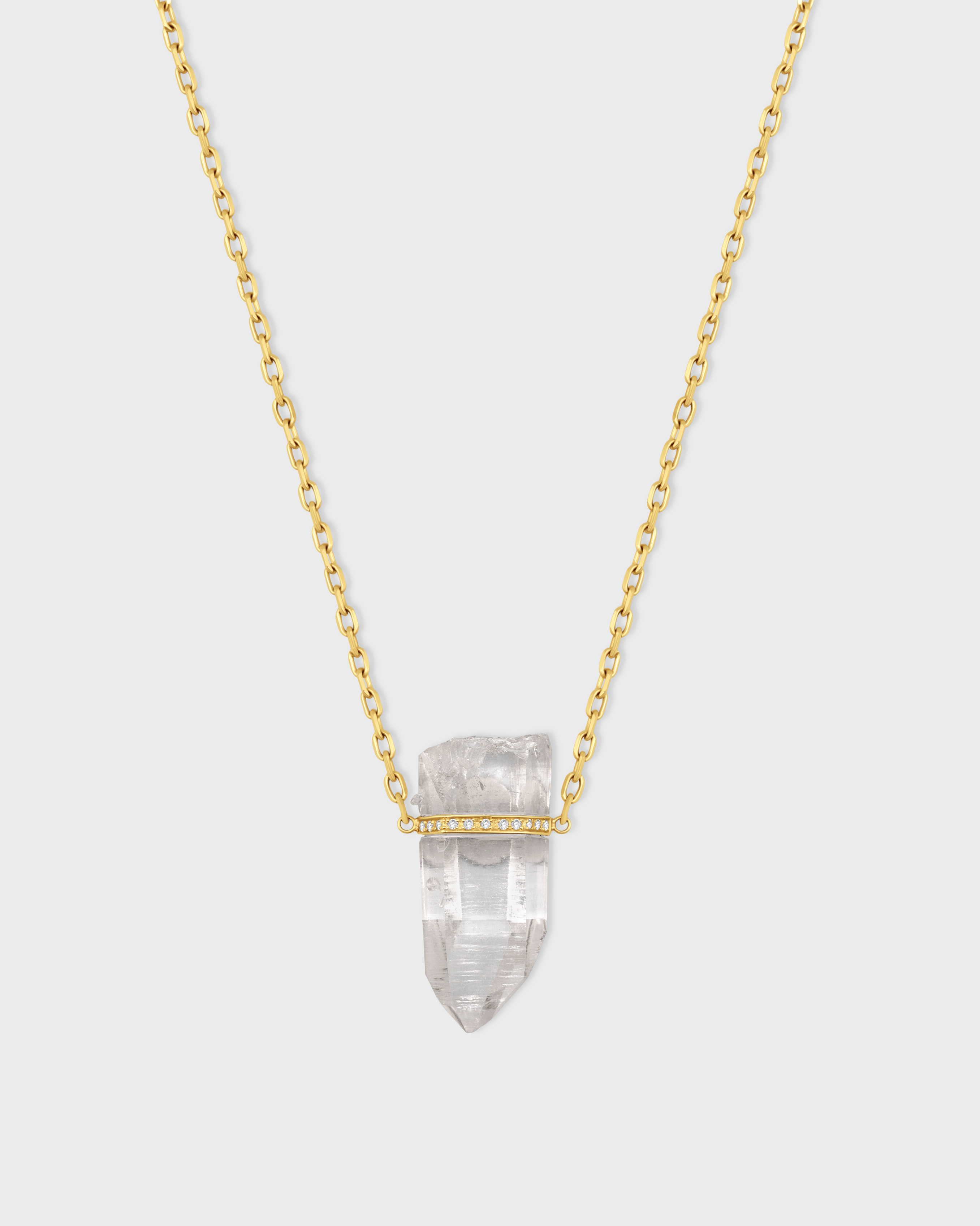 Our larger iteration of the diamond bar necklace with a larger crystal quartz, more diamonds, and more substantial gold chain. A statement piece not to be missed. Master of all healing crystals, our clear crystal quartz is custom hand set to the natural shape of the stone in 14 karat yellow gold on Italian gold chain. Diamonds placed to the energetic formation of each crystal. Truly one of a kind piece, created to attune to the vibration of each individual wearer.
