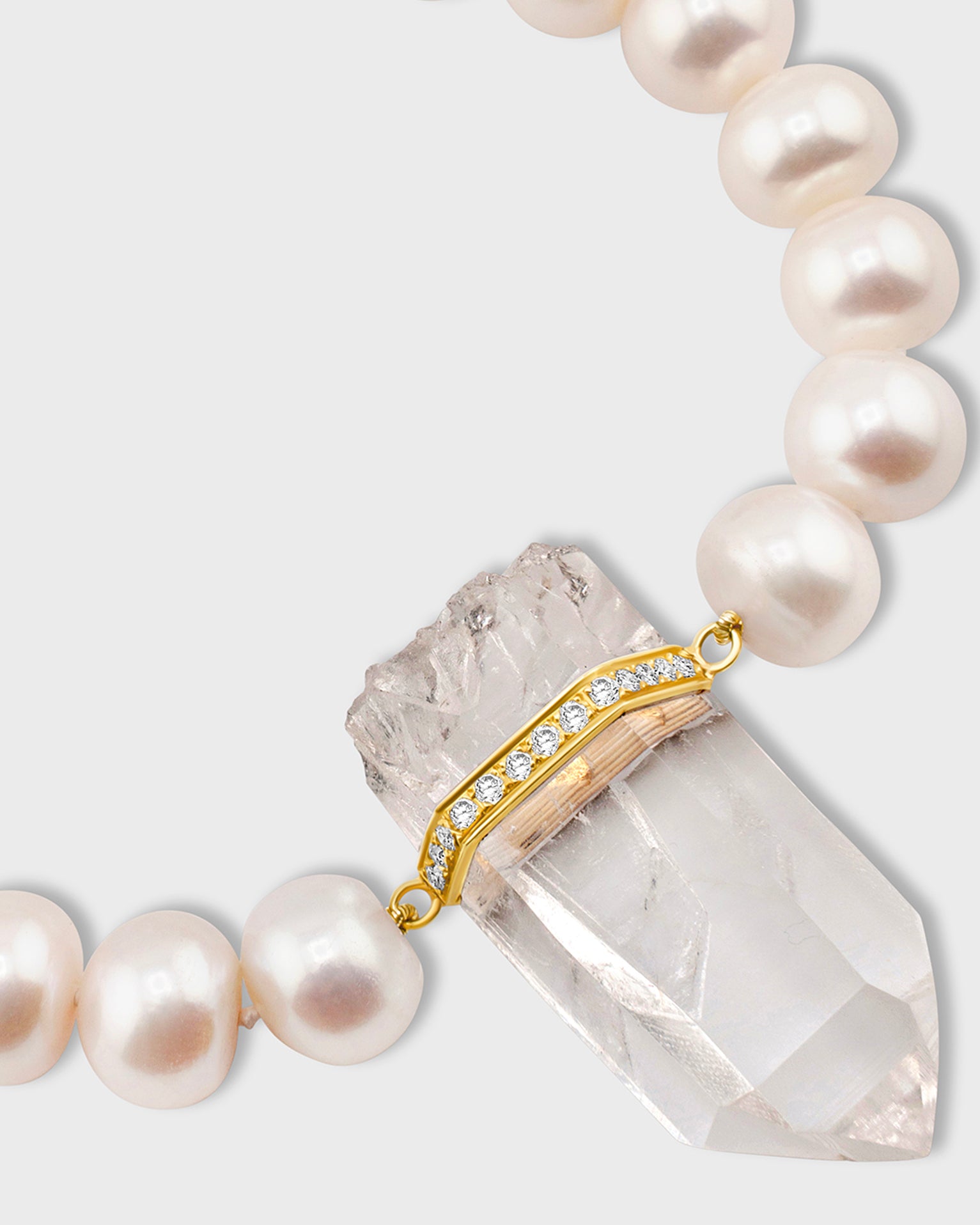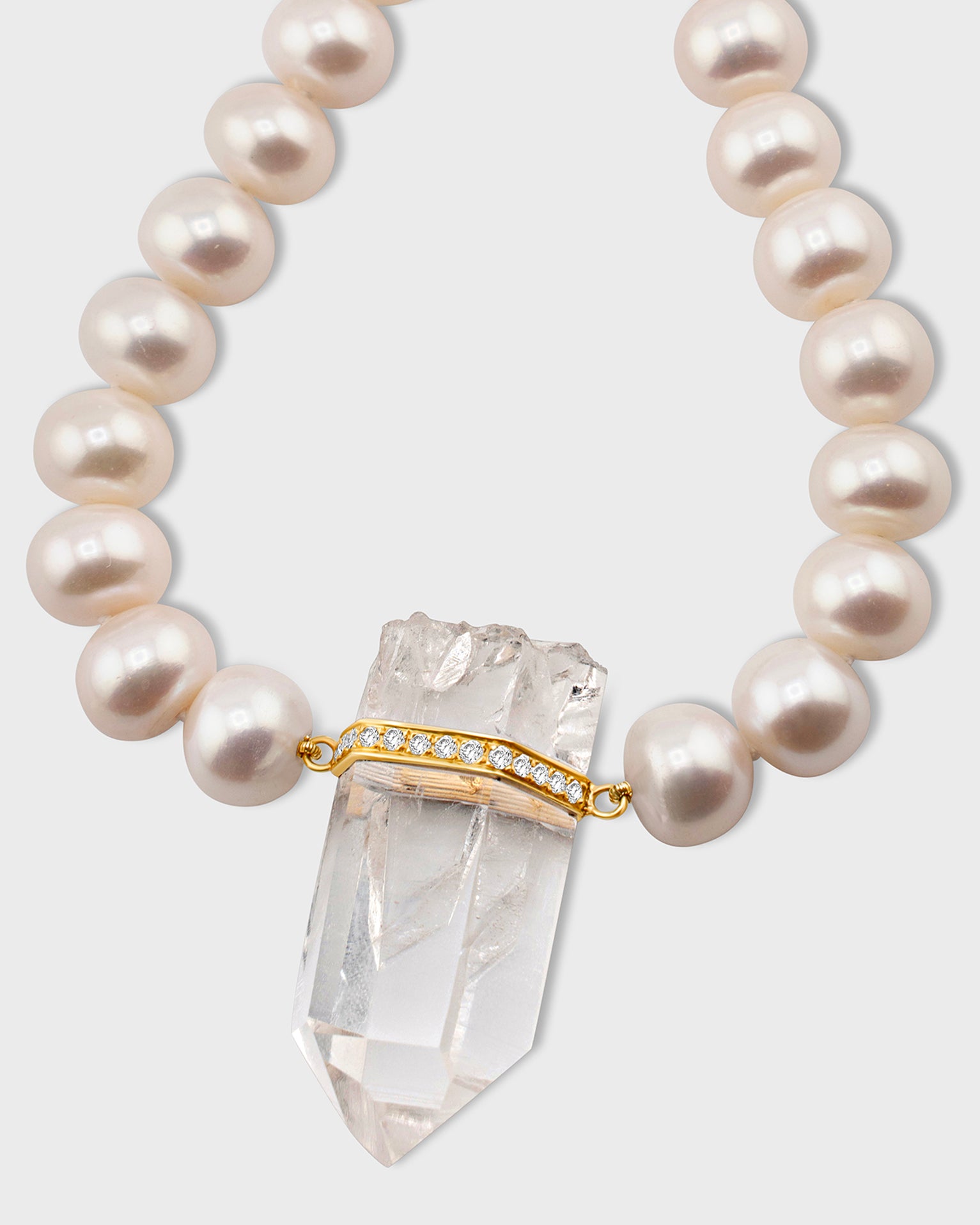 Beautiful large freshwater pearls hand strung with a center crystal quartz pendant custom hand set with diamonds.