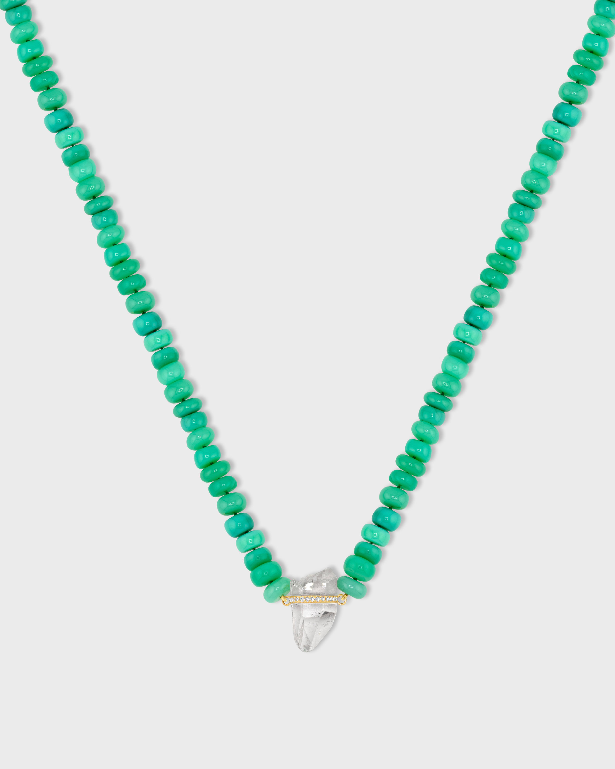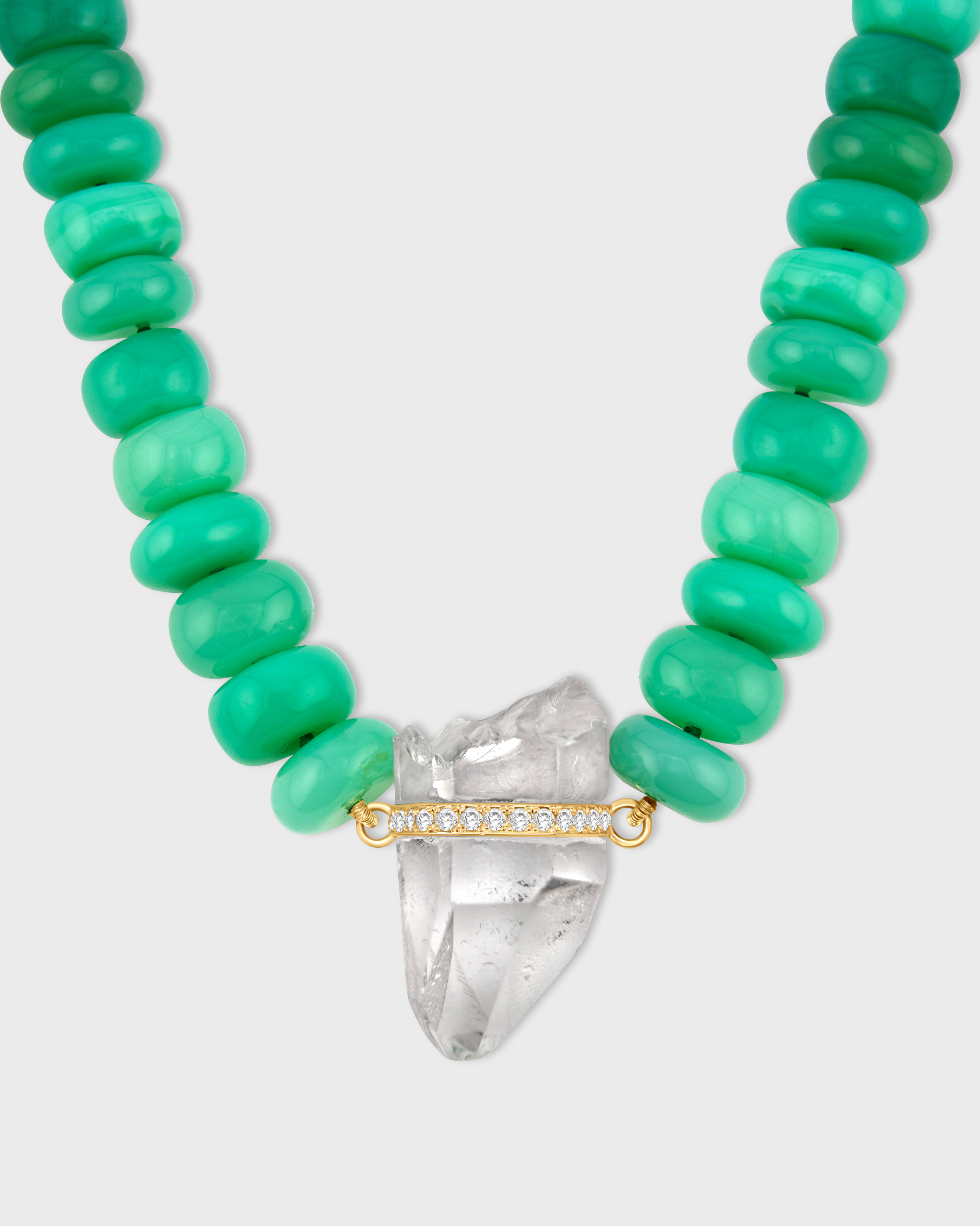 The Chrysoprase Crystal Quartz Diamond Bar Necklace features a striking combination of vibrant green chrysoprase beads and a raw crystal quartz centerpiece. The crystal is delicately accented with a diamond-encrusted gold bar, adding a touch of elegance and energy to the piece.