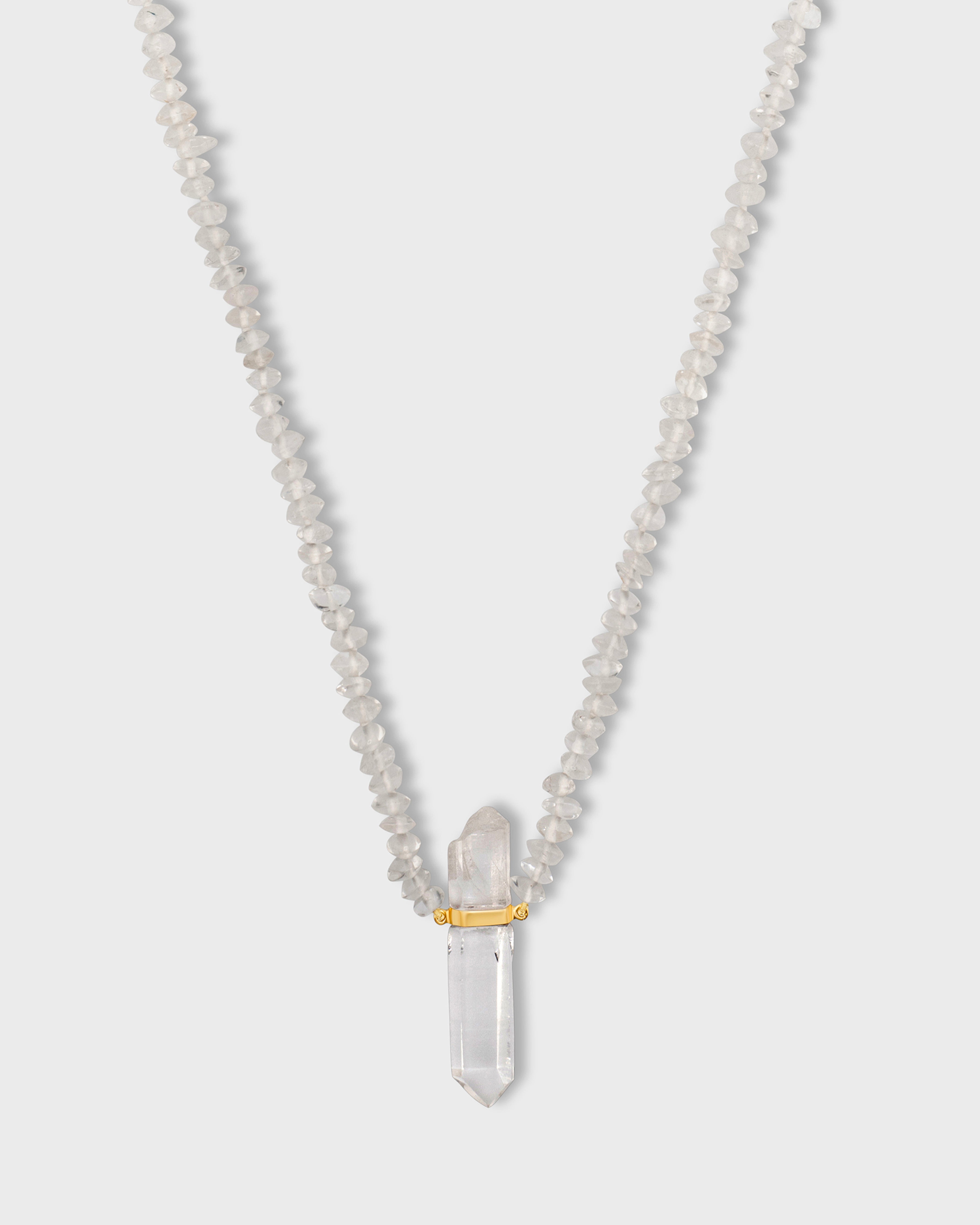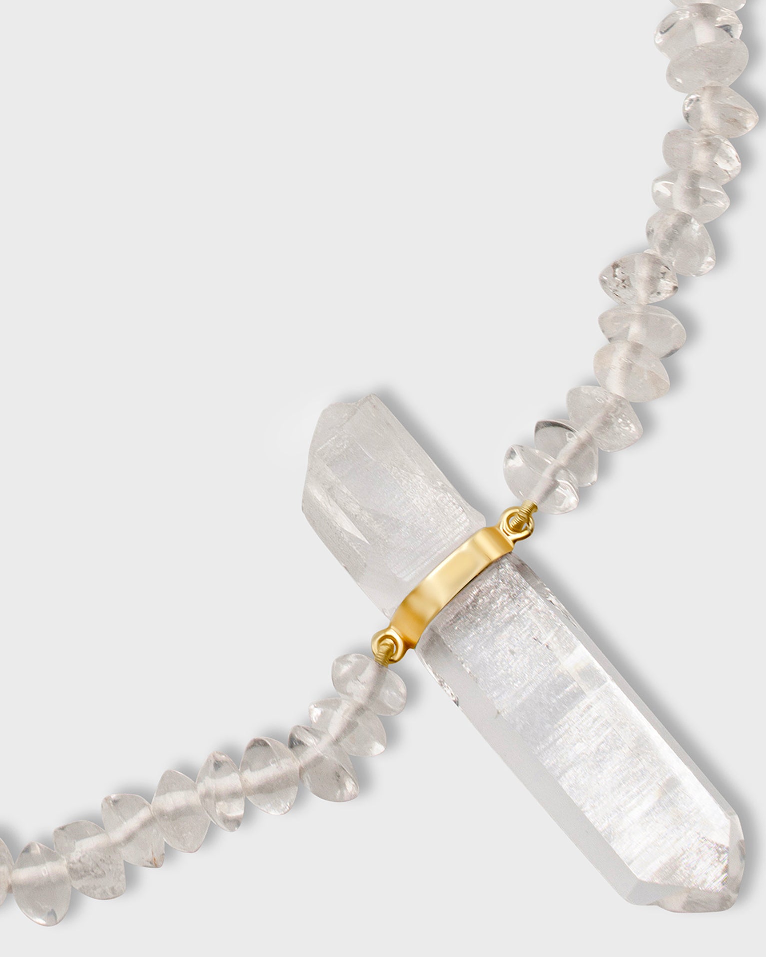 A complete crystal quartz crystal necklace with our signature crystal quartz charm that is custom handset in 14 karat gold in our New York City workshop. Each crystal is one-of-a-kind with natural clarity and shapes that attune to vibrational needs of the beholder.