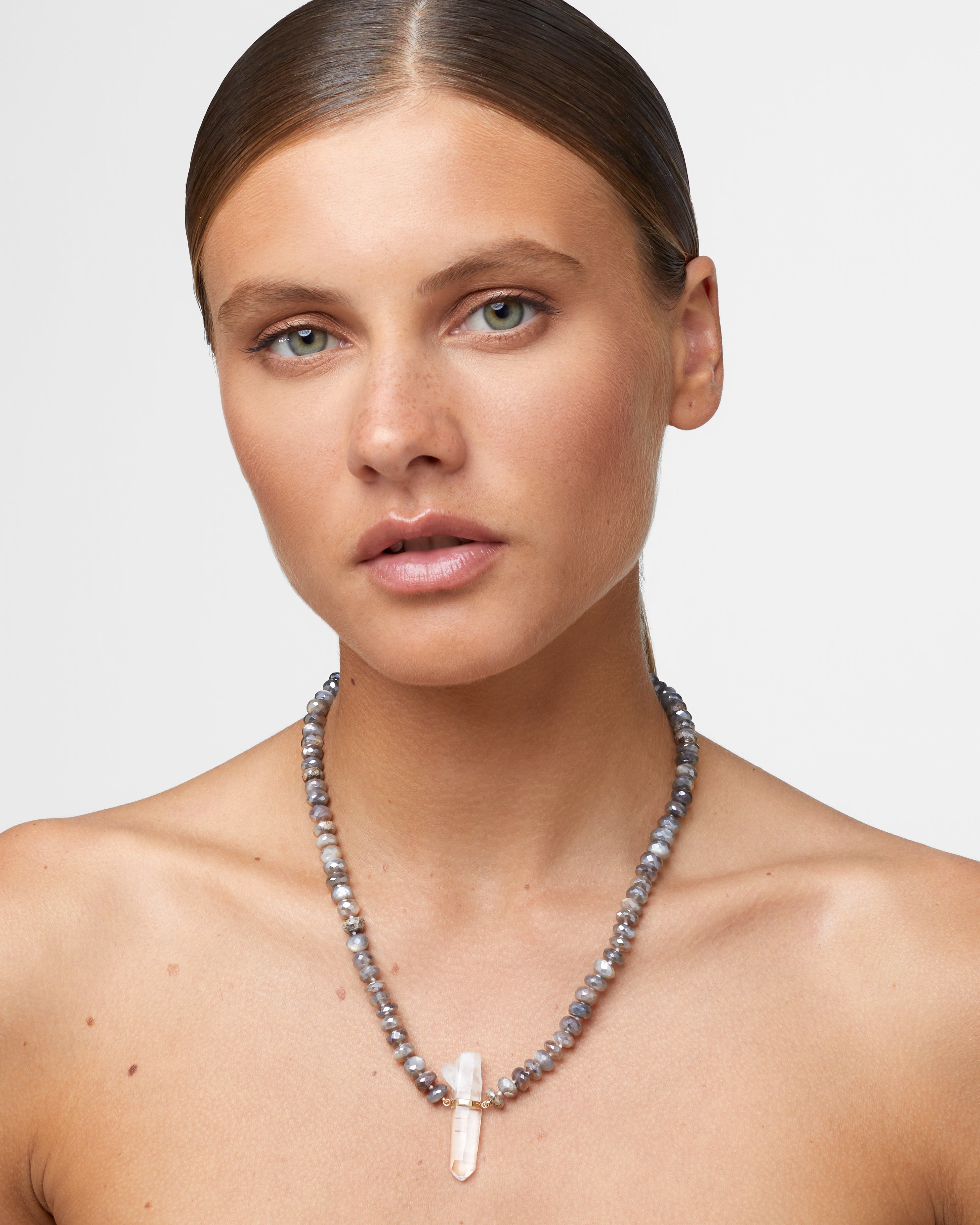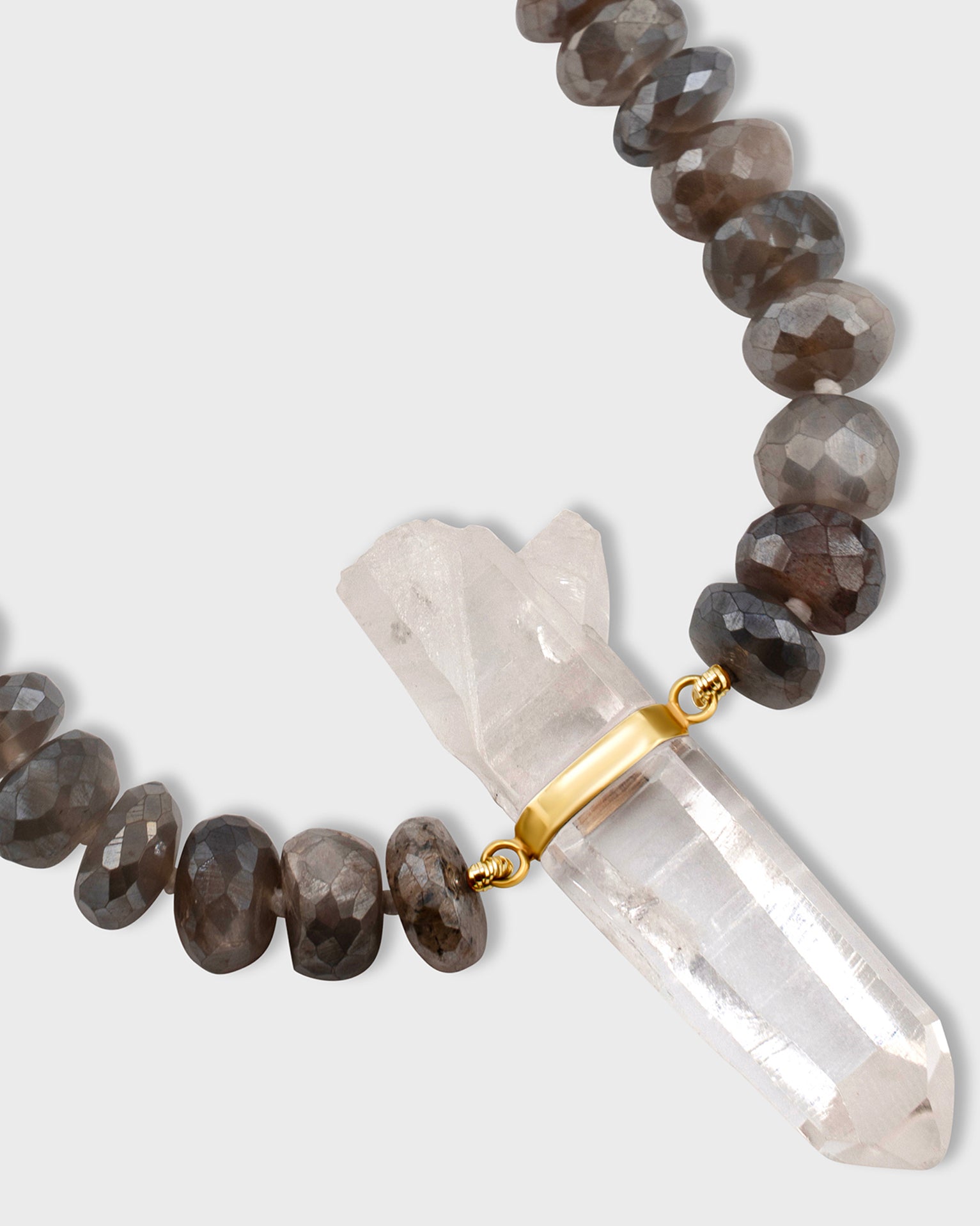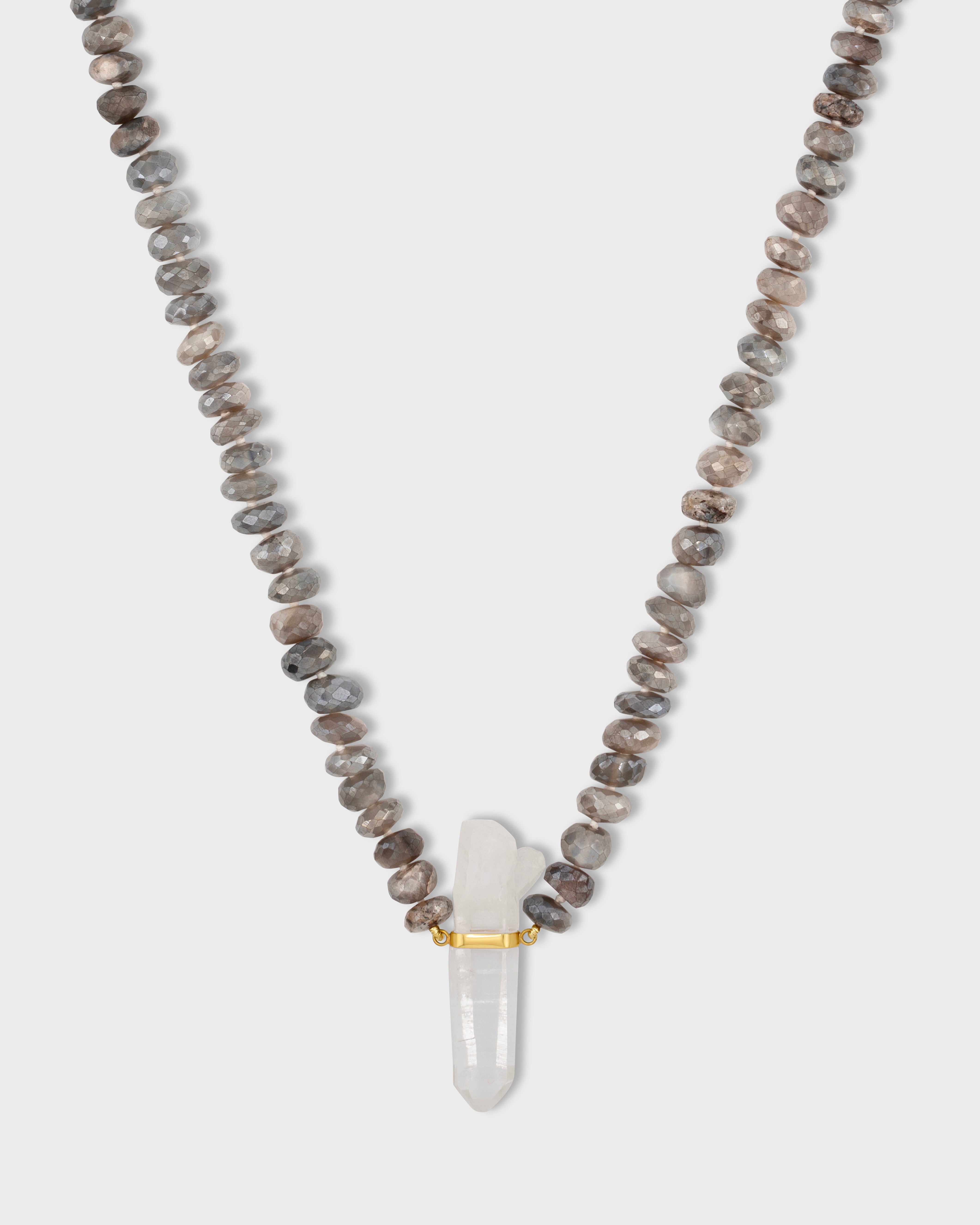 Shimmering labradorite beads and a raw quartz charm capture the essence of mystery and intuition. This necklace radiates an enchanting glow, perfect for inspiring creativity and self-discovery.