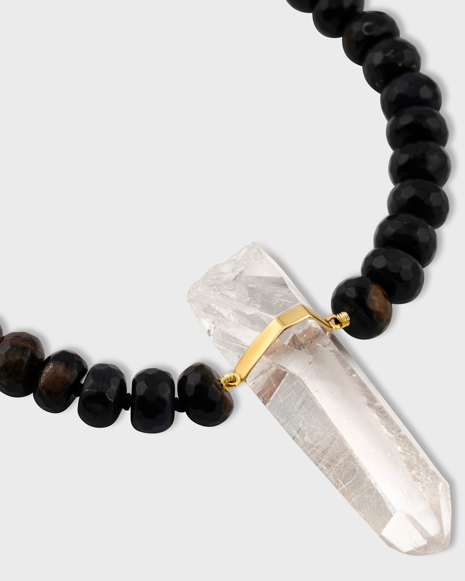 Beautiful tigers eye in faceted cuts adorned in the center with our signature crystal quartz with custom hand set gold bar.