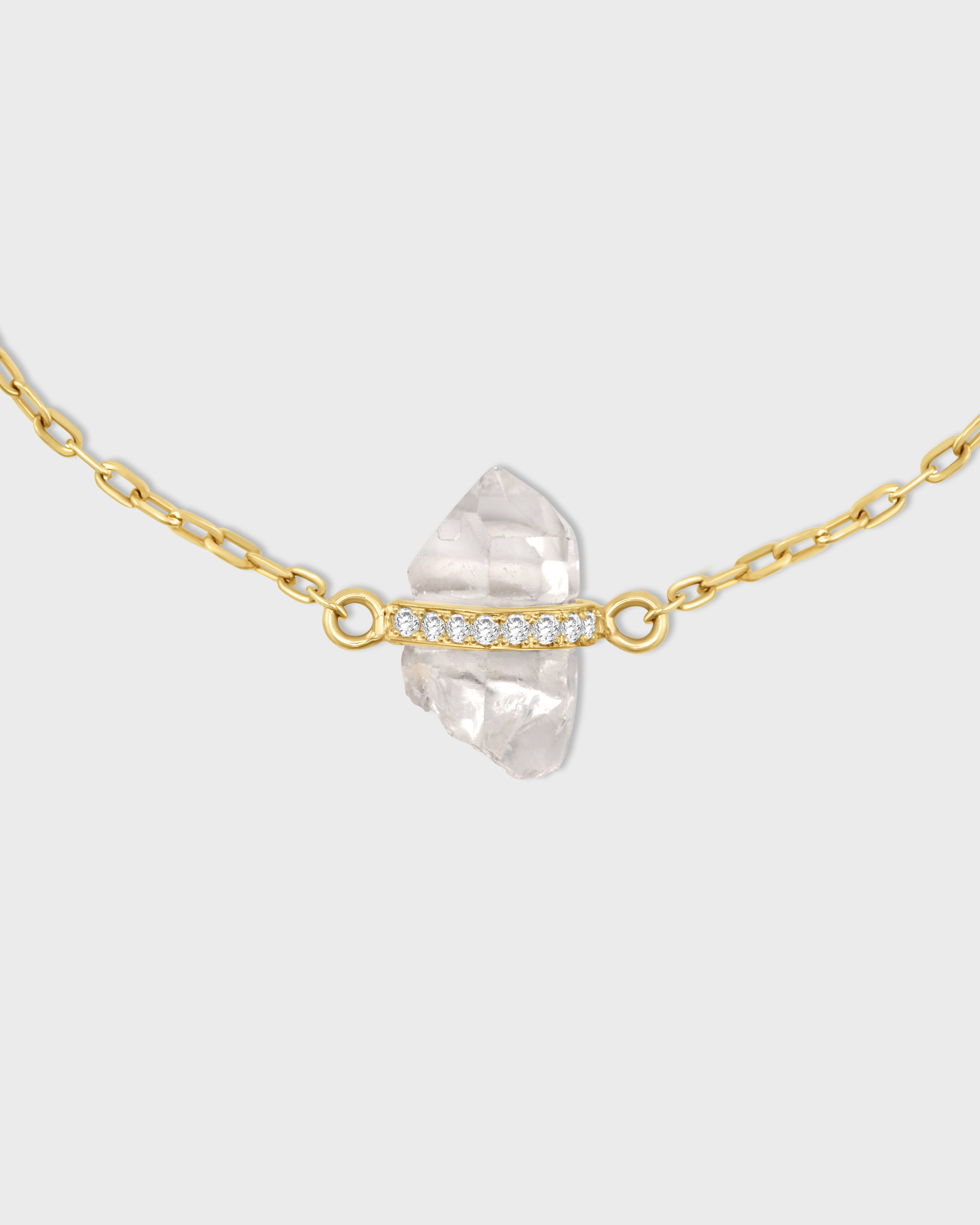 A custom-set crystal quartz centerpiece on a sleek gold chain. The centerpiece is accented with a diamond-studded bar, adding a touch of sparkle and elegance.