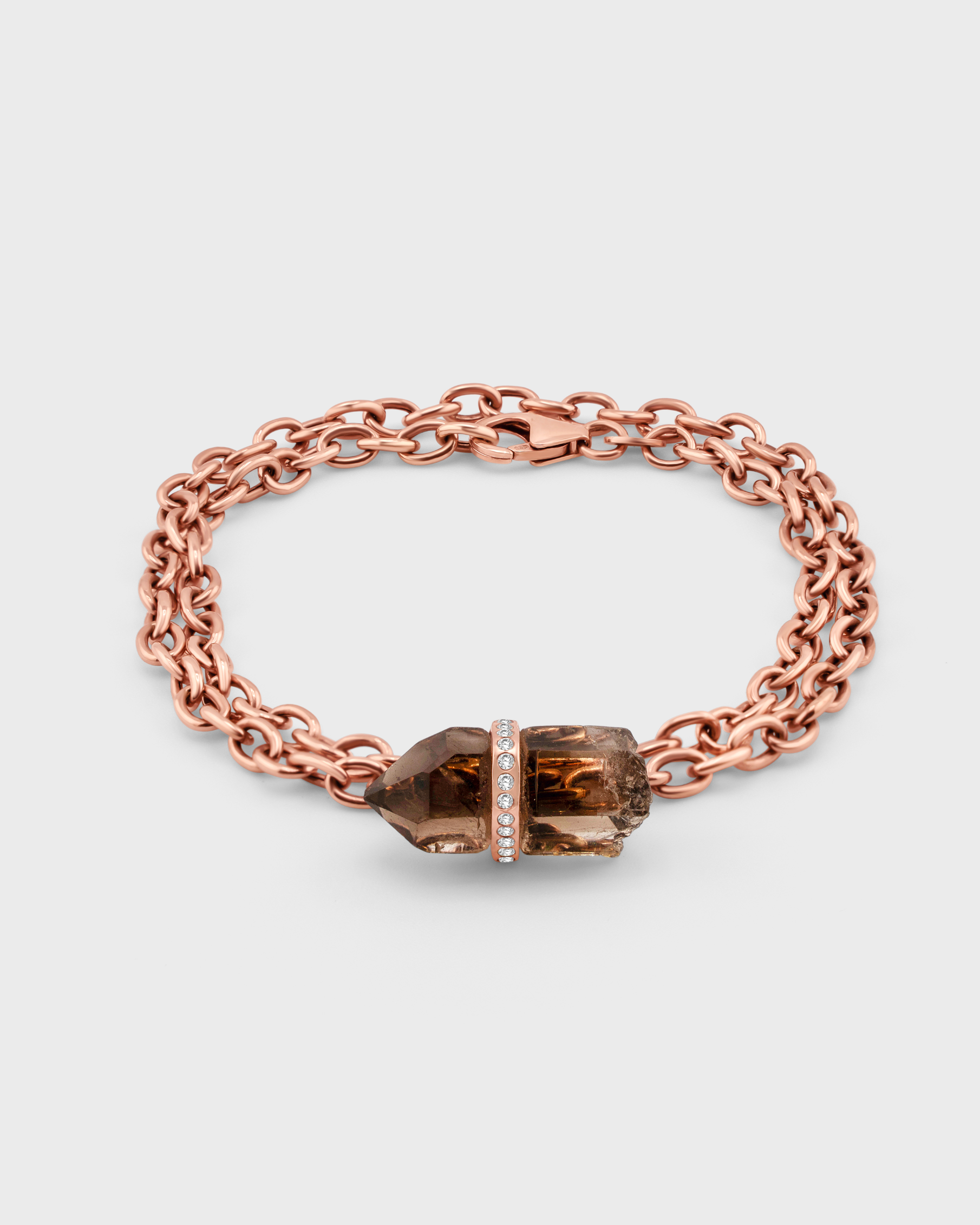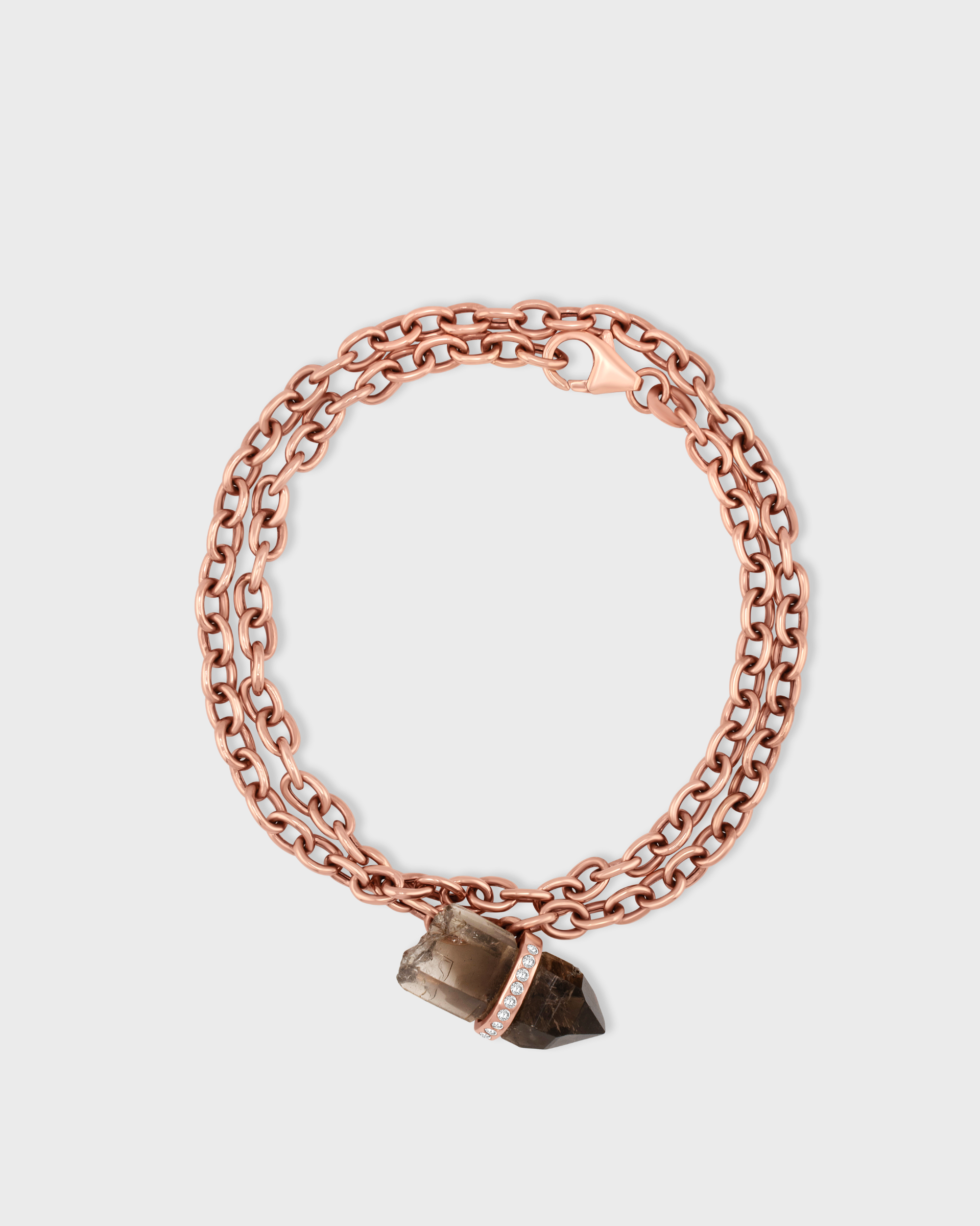 Smoky Quartz custom hand set in rose gold with diamonds on a double wrap 14 karat chunky rose gold cable chain bracelet.