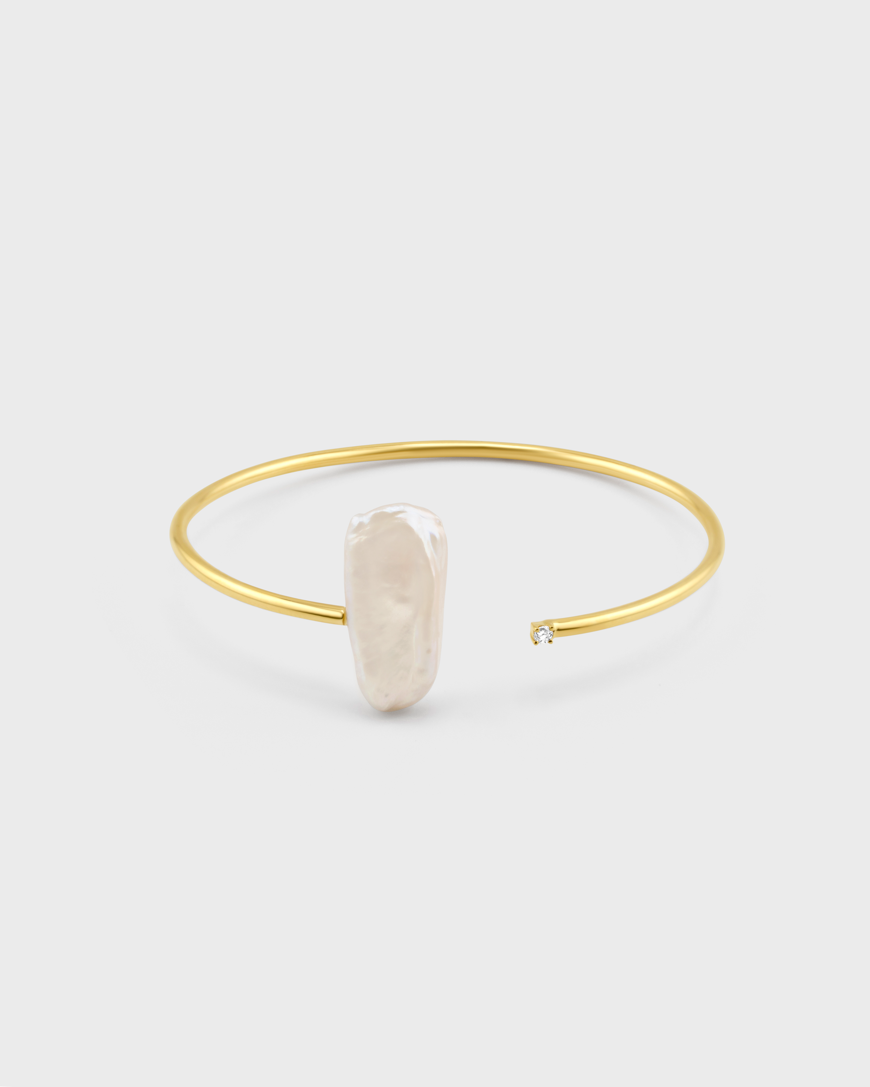Freshwater pearl and diamond bendable cuff made with 14 karat yellow gold.