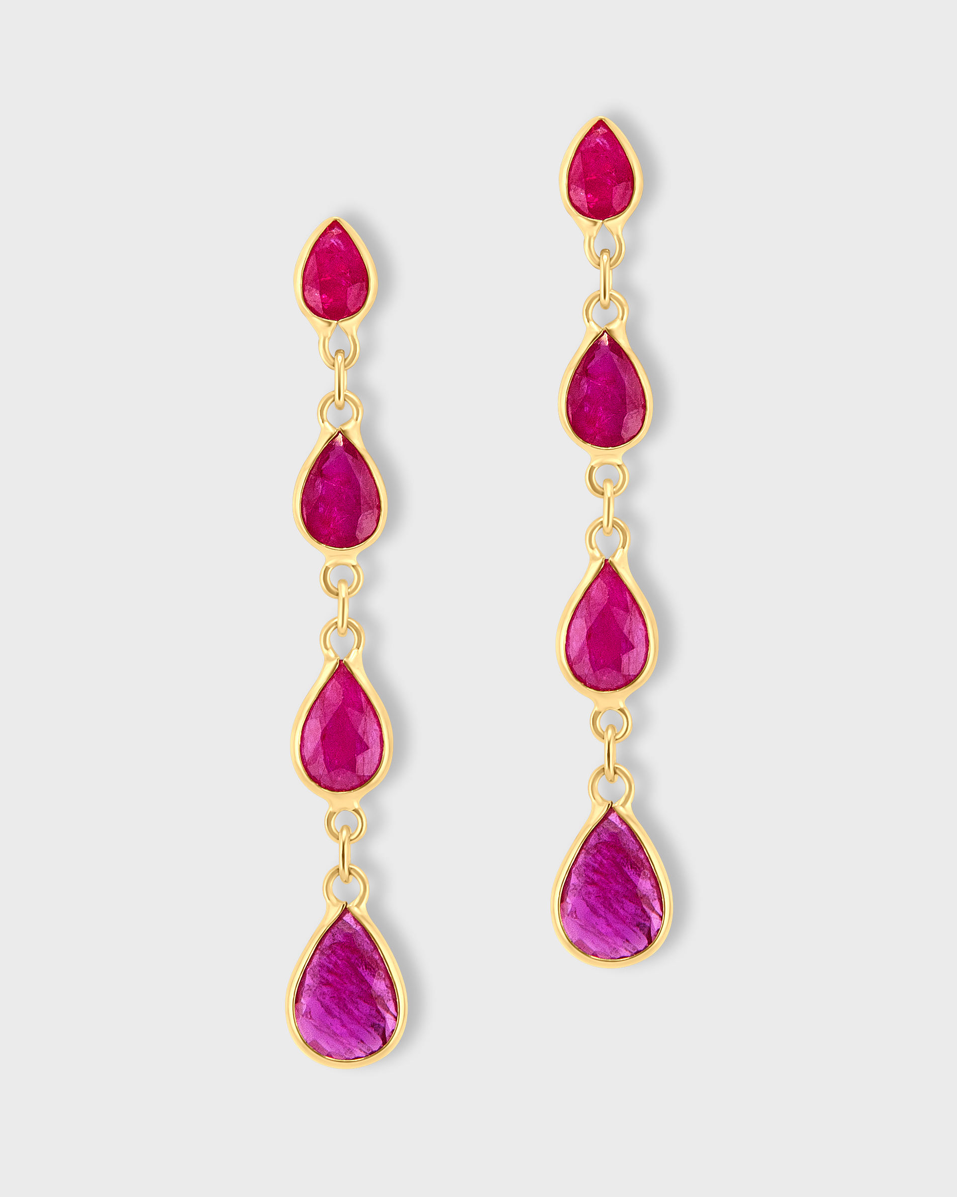 These elegant drop earrings feature a series of sparkling ruby, suspended from a delicate gold chain. The cascading design and vibrant color create a stunning and eye-catching piece.