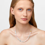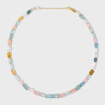 Multi-colored aquamarine morganite gemstones hand strung in New York City and finished with 14k yellow gold.