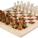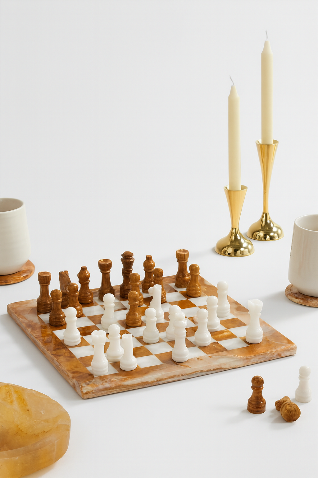 Hand-carved from elegant marble and onyx, this refined chess set features naturally veined stone pieces and a polished checkered board — a timeless display of craftsmanship and sophistication for both play and decor.