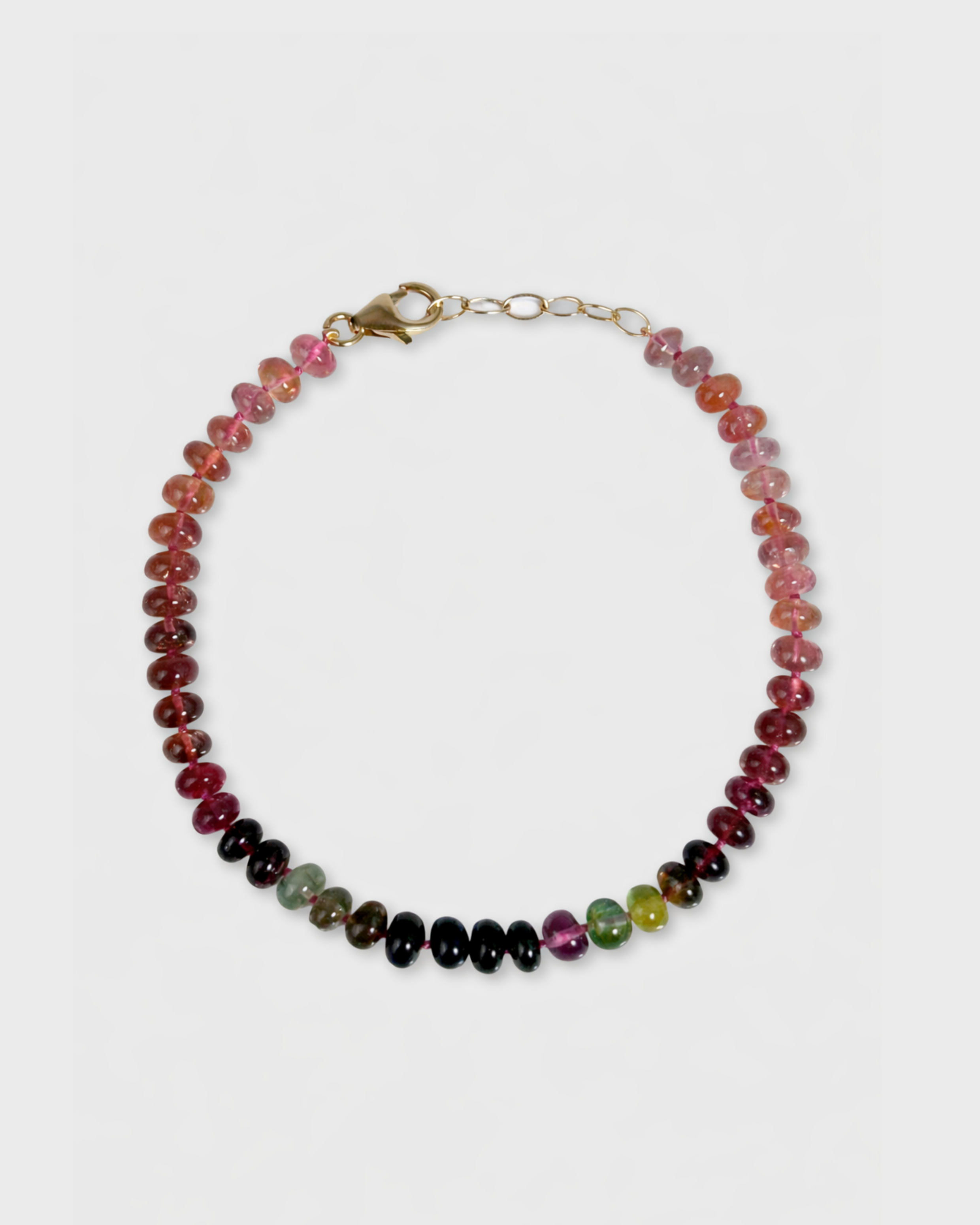 A vibrant strand of natural watermelon tourmaline beads, this bracelet celebrates the full spectrum of color found in nature. Hand-strung and finished in 14k gold, it’s a radiant, everyday talisman of beauty and harmony.