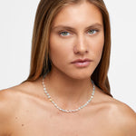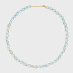 Featuring faceted oval aquamarine stones, this necklace brings a serene, cool blue color to any ensemble. The sparkling stones capture the light beautifully, evoking the calming and refreshing qualities of the ocean.