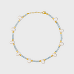 Natural aquamarine, freshwater pearls, and gold beads hand strung in the heart of New York City and finished with 14 karat yellow gold.